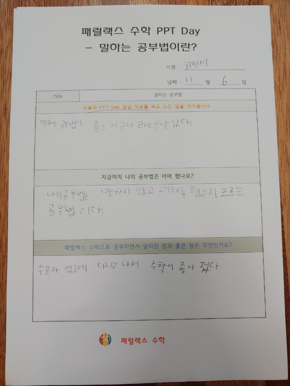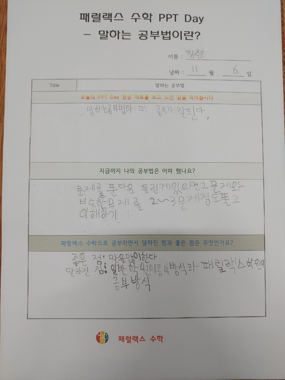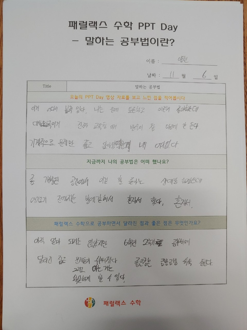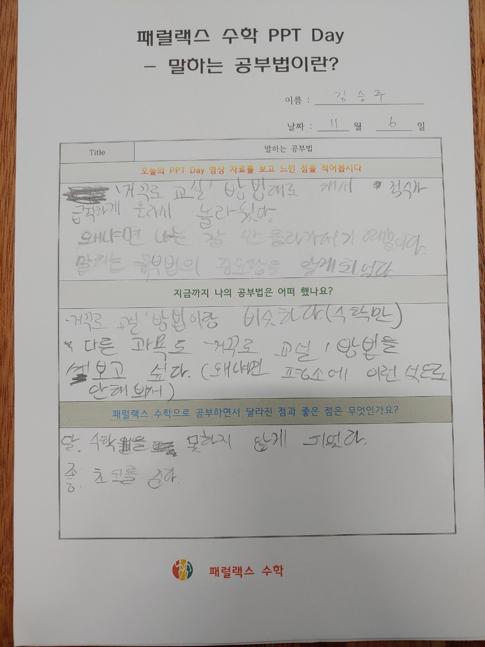 Parallax수학 수업시간 중 스스로 공부한 개념을 발표하는 학생