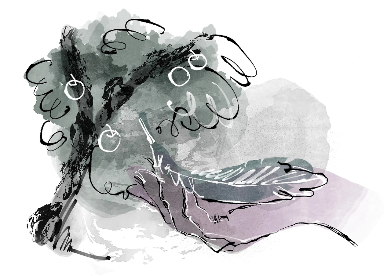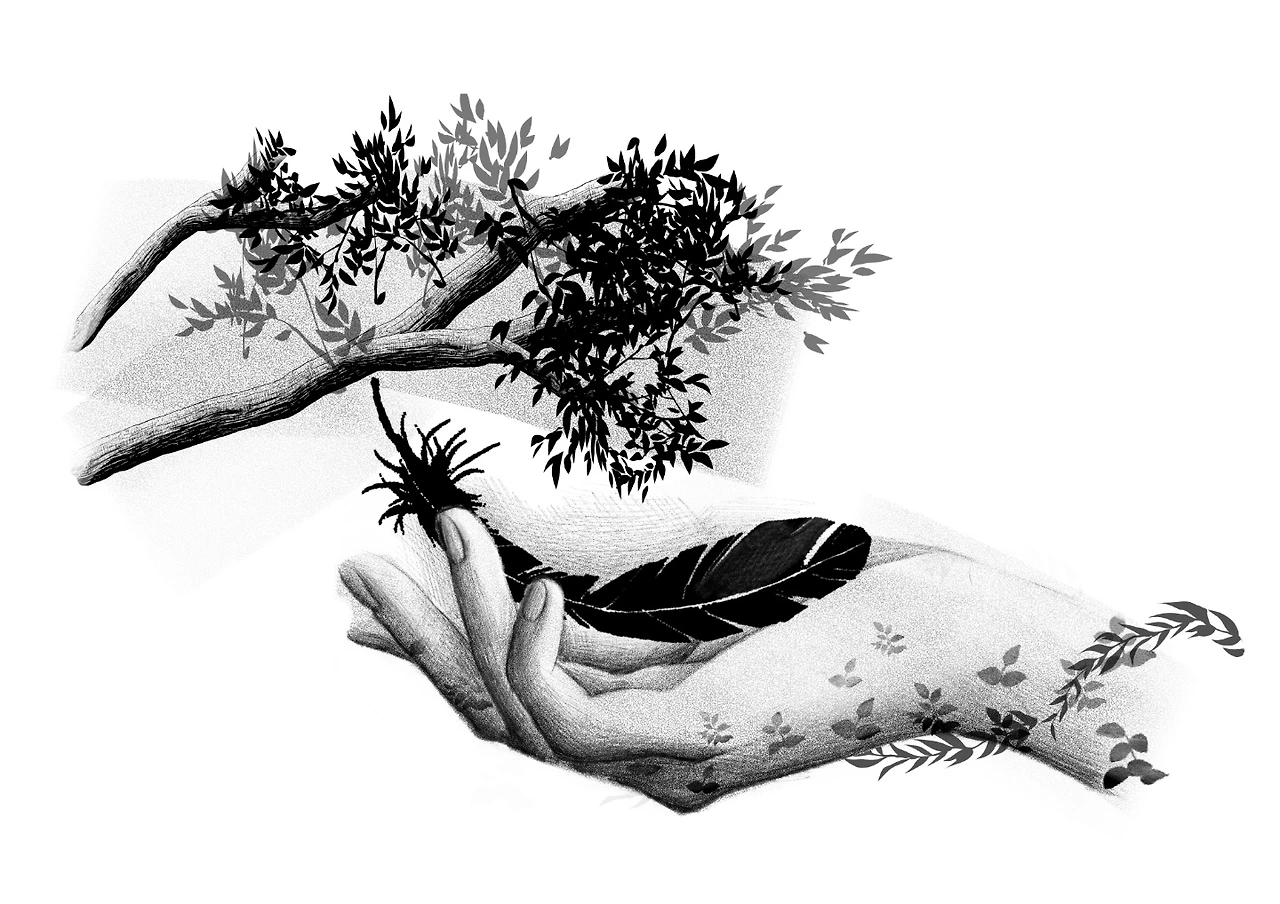 나무 잎사귀들이 손목을 감싸고 있는