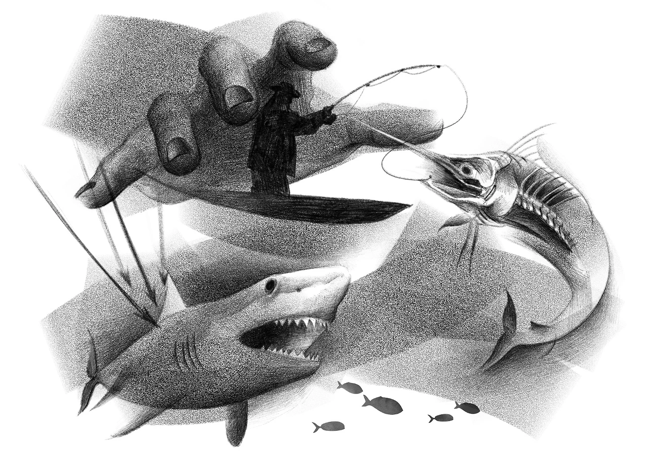 노인은 청어를 잡은 낚싯대를 놓지않고