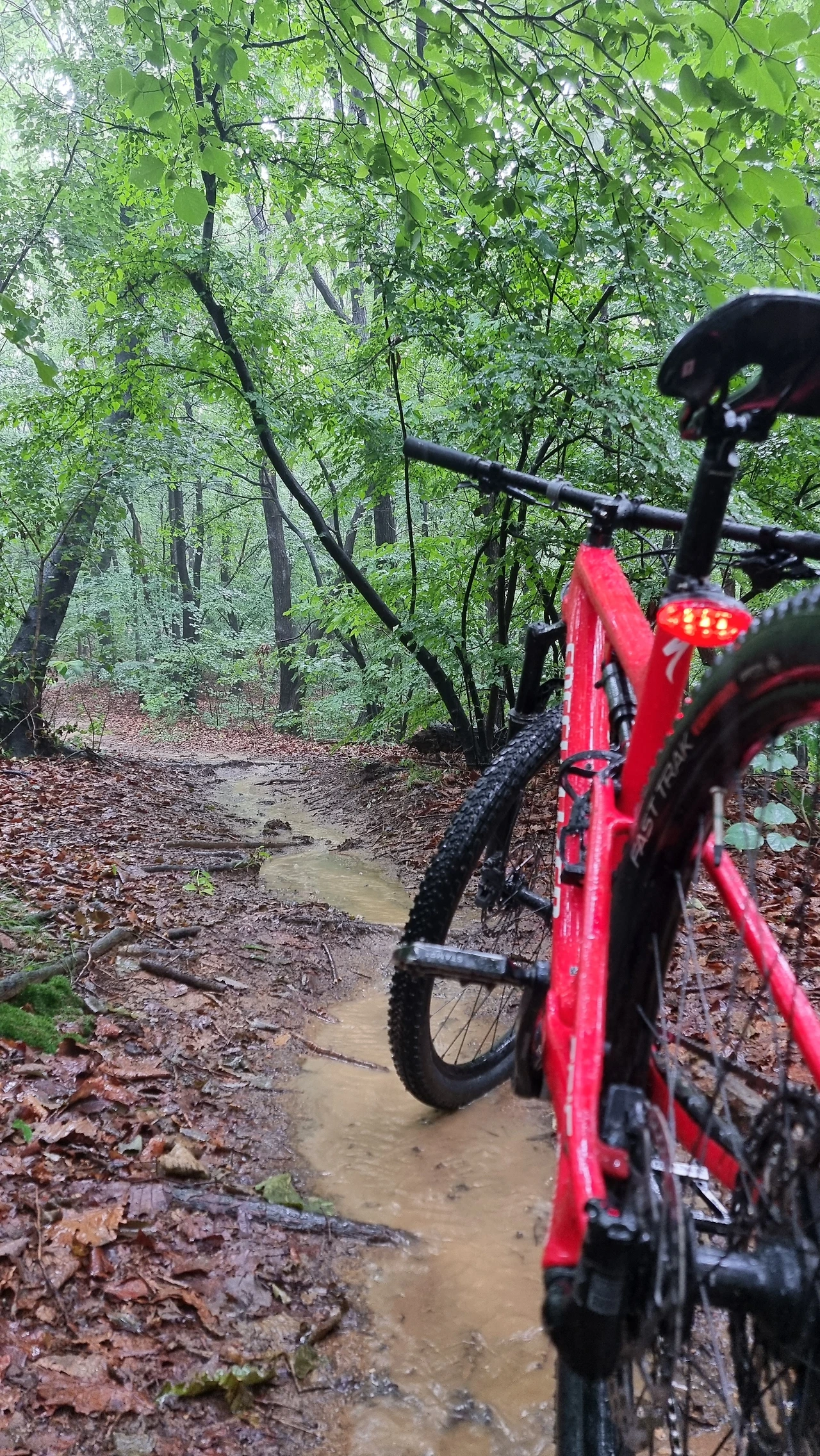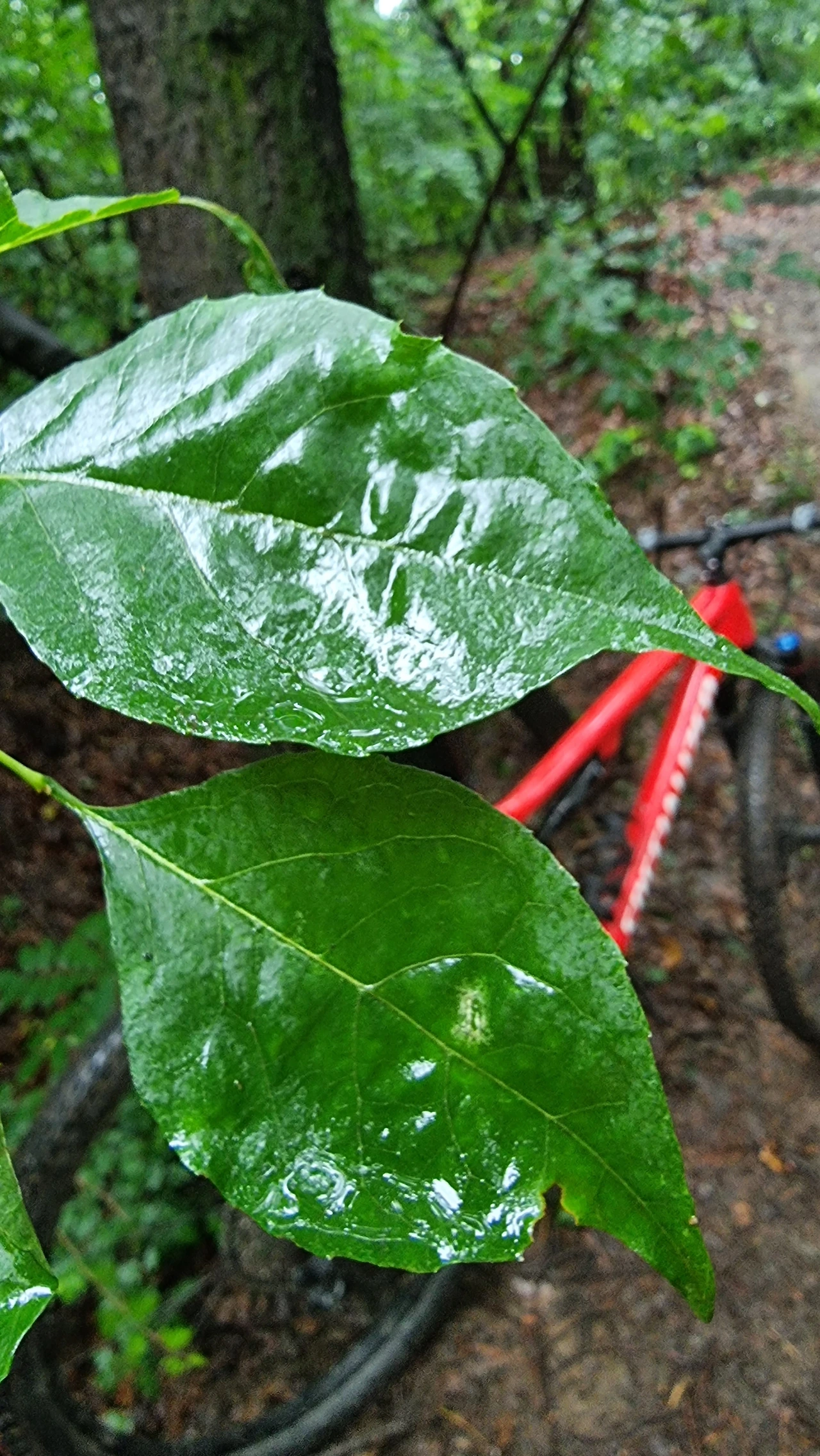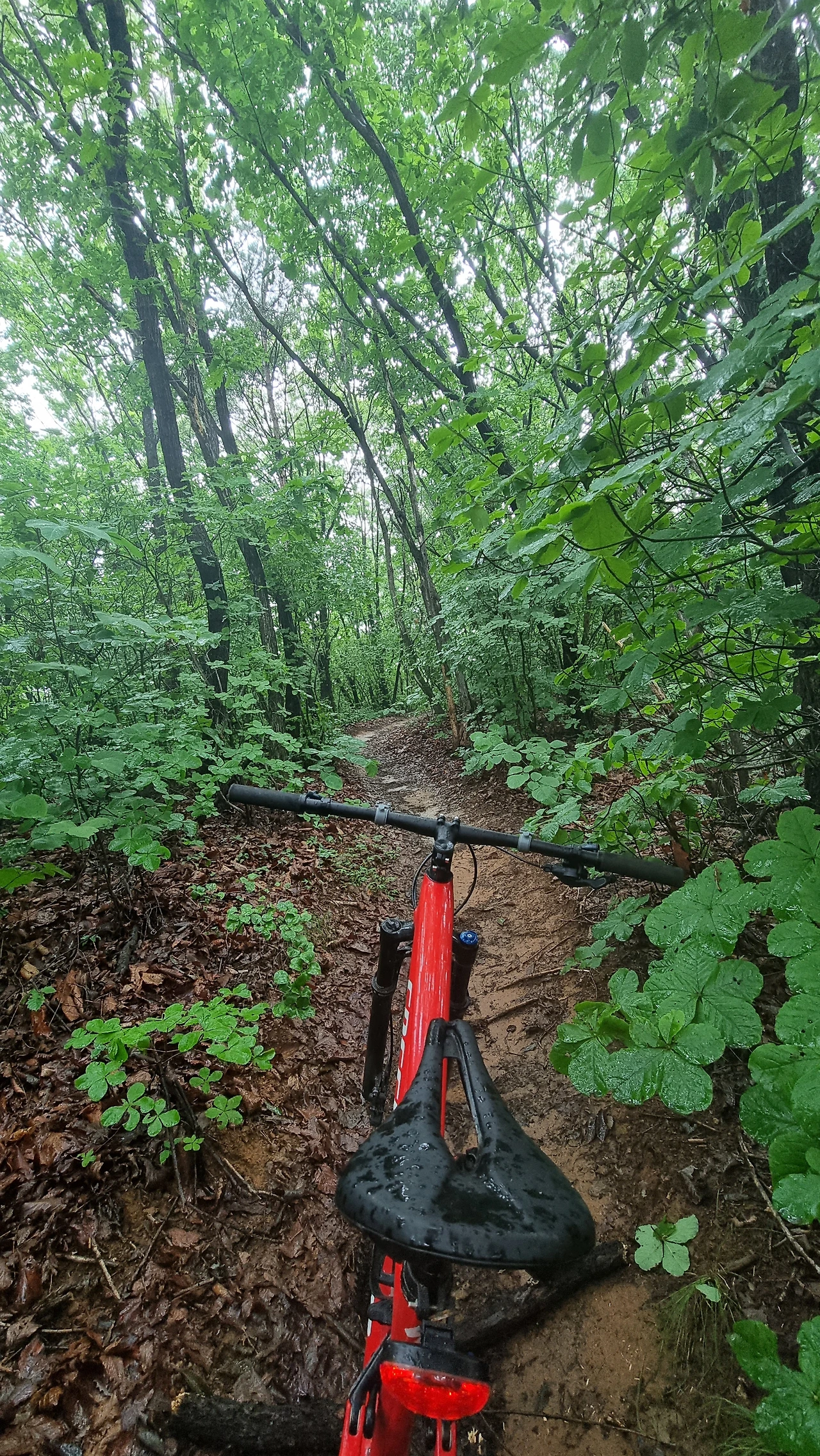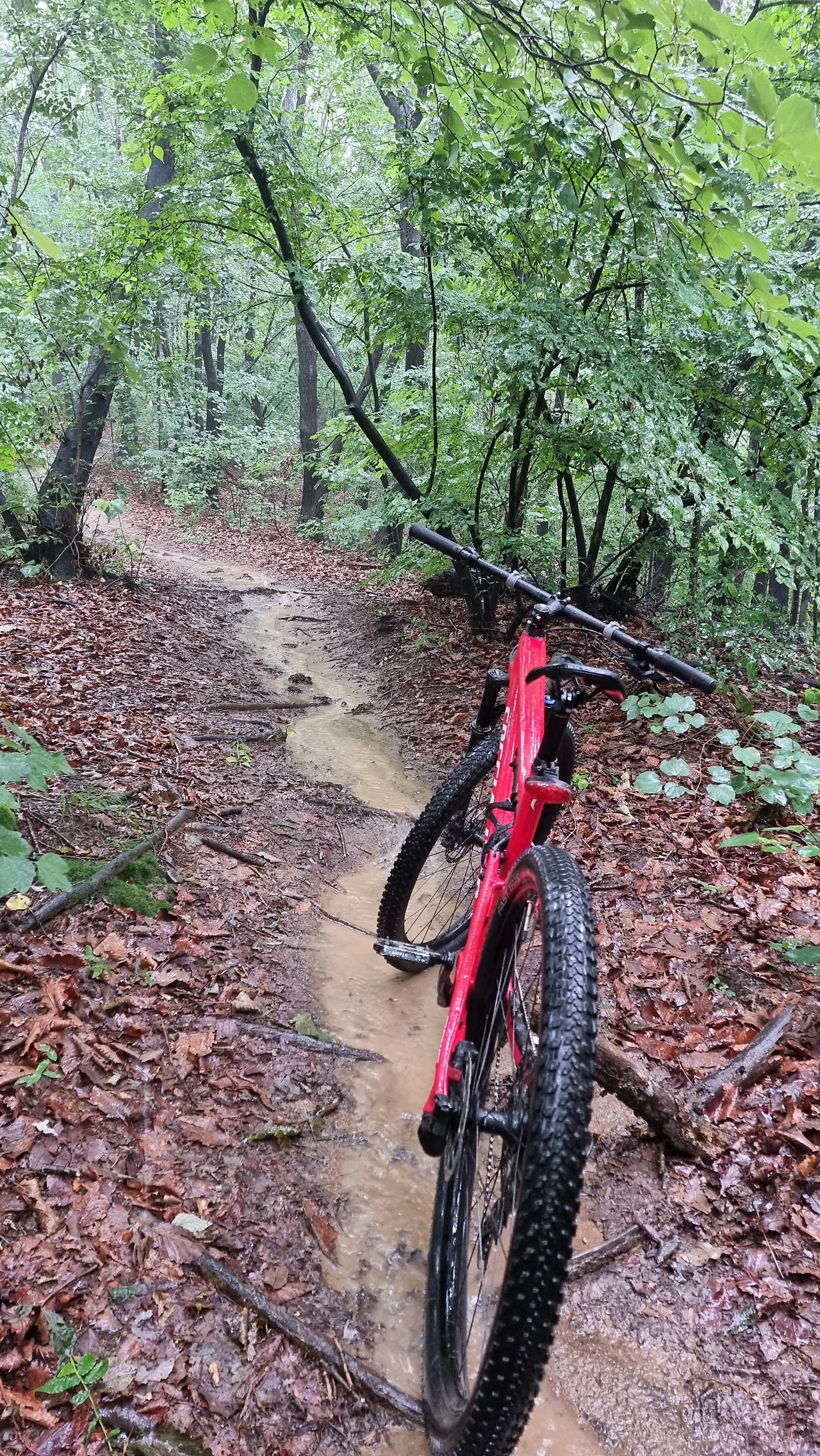 비 오는 한 여름날 숲 속에서 자전거를 타며