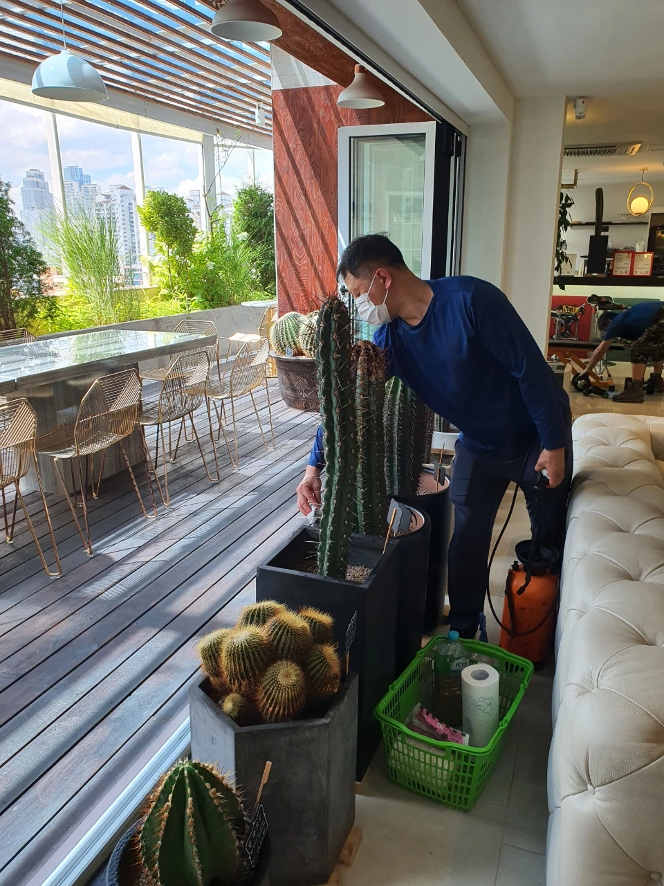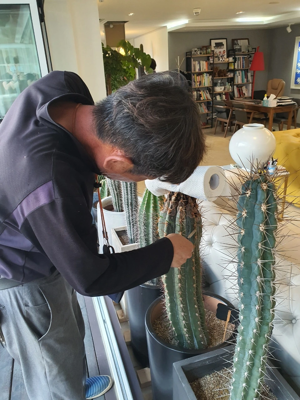 8층 사무실에 30년이나 된 선인장들이 흡연하는 사람들의 손때로 바이러스가 감연되어 대대적인 수술 중이다.