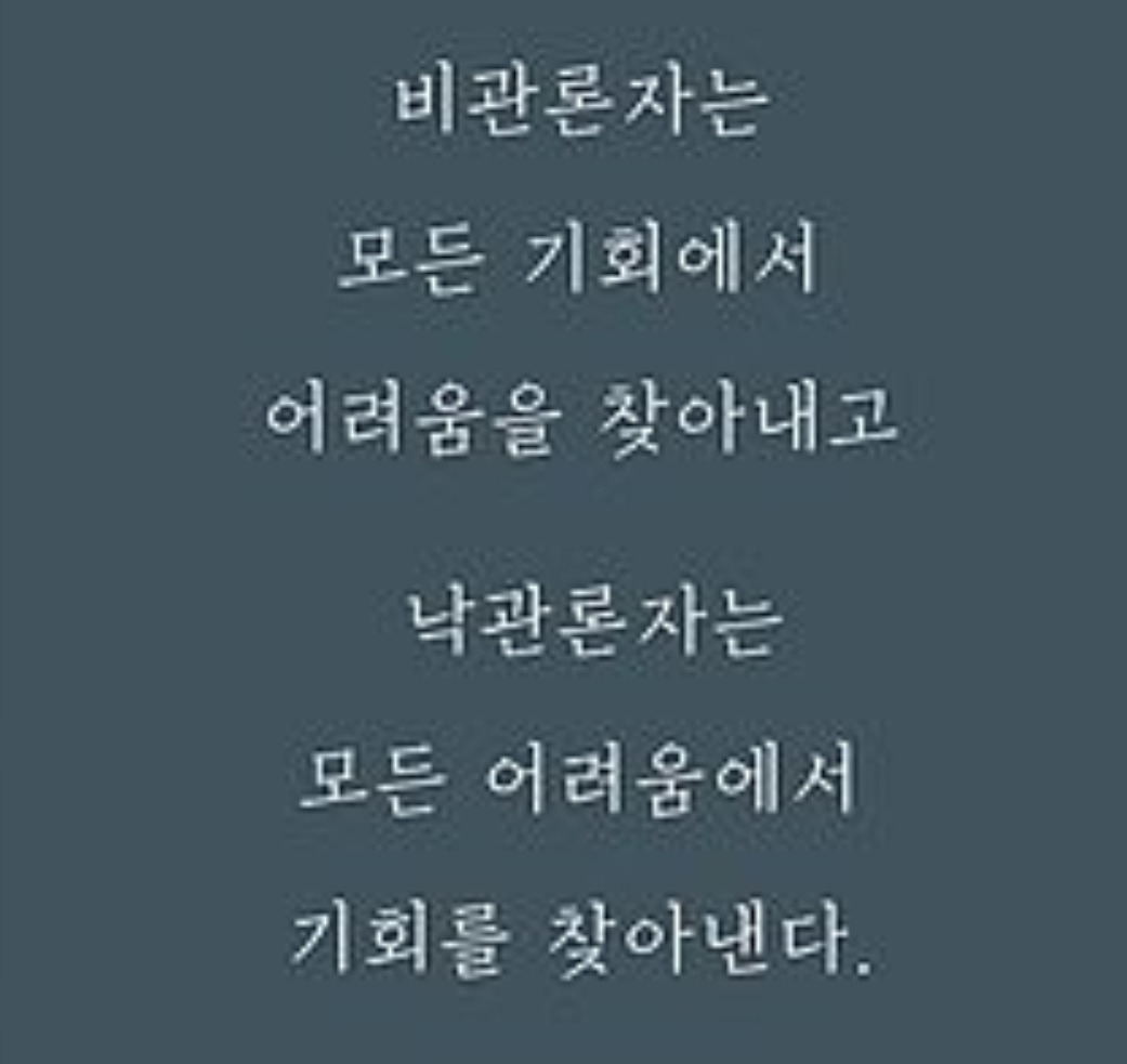 비관론자는 기회에서 어려움을 찾아내고 낙관론자는 어려움에서 기회를 찾아