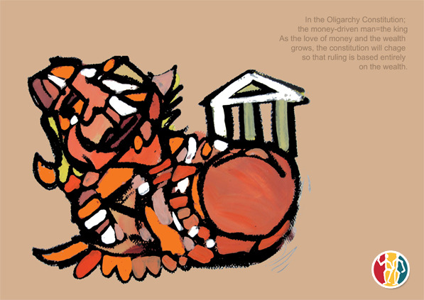 과두 정체는 재물이 가장 중시되는 나라입니다. 어찌 보면 현대 자본주의의 어두운 면만 골라 놓은 나라입니다. 역설적으로 명예 정체를 무너뜨리는 것은 그들의 풍족한 재산입니다. 사람들이 서로 경쟁하면서 돈을 벌려고 하면 할수록 훌륭함은 줄어듭니다. 부자들은 점점 귀하게 대접을 받고, 훌륭한 사람은 멸시를 당합니다. 그리하여 승리와 명예를 사랑하던 명예 정체는 마침내 돈과 돈벌이를 우르러보는 과두 정체로 더 타락하게 됩니다. 나라의 법을 정할 때도 재산의 많고 적음이 기준이 되고, 재산이 적은 사람은 관직에 참여하지도 못합니다. 과두 정체는 빈자와 부자의 두 분류가 함께 살면서 서로 반목하고 갈등을 겪게 됩니다. 게다가 거지, 도둑, 소매치기 등 나쁜 짓을 하는 사람들도 늘어나게 됩니다. 이는 교육 부족과 잘못된 양육 탓입니다. 명예 정체적 인간이 과두 정체적 인간으로 변화하는 과정은 이렇습니다 명예 정체적 사람의 자식은 처음에는 부모를 닮으려고 노력합니다. 그런데 만약 부모가 억울하게 처벌을 받아, 처형당하거나 추방되거나 또는 재산을 몰수라도 당하면 자식은 잔뜩 겁을 먹습니다. 그러다 명예에 대한 사랑과 격정은 영혼에서 지워지고, 가난에 시달린 나머지 돈벌이에 열중하게 됩니다. 결국 그의 이성과 격정은 욕구 앞에 굴복하게 되고, 명예를 사랑하던 사람이 한순간에 재물을 사랑하는 사람으로 바뀌게 됩니다.