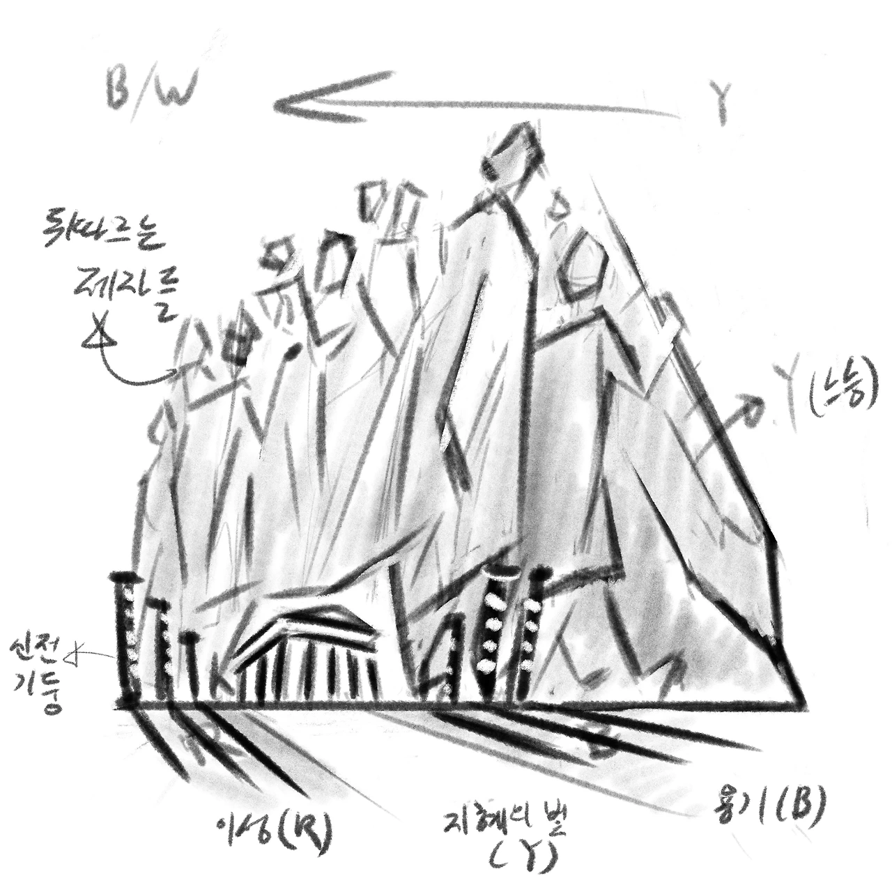 추상화의 밑부분 세 가지 색은 아리스토텔레스