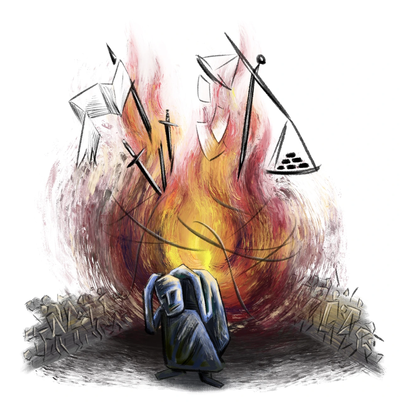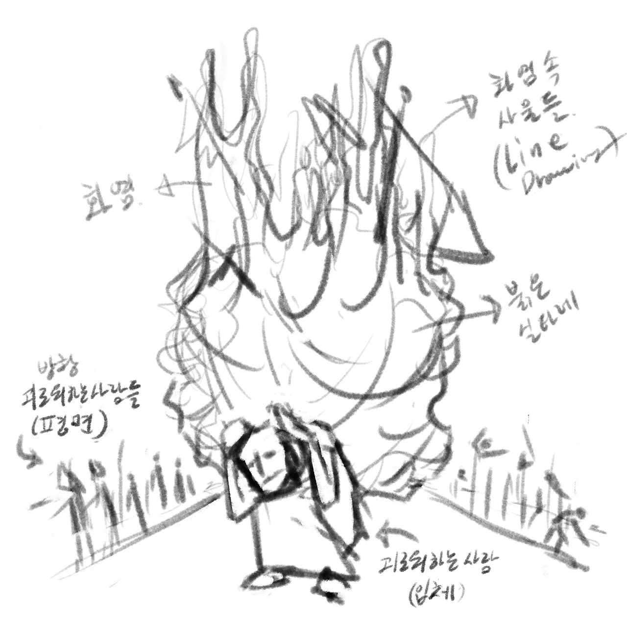 전쟁을 상징하고,불꽃은 힘겹고 치열한 전쟁을