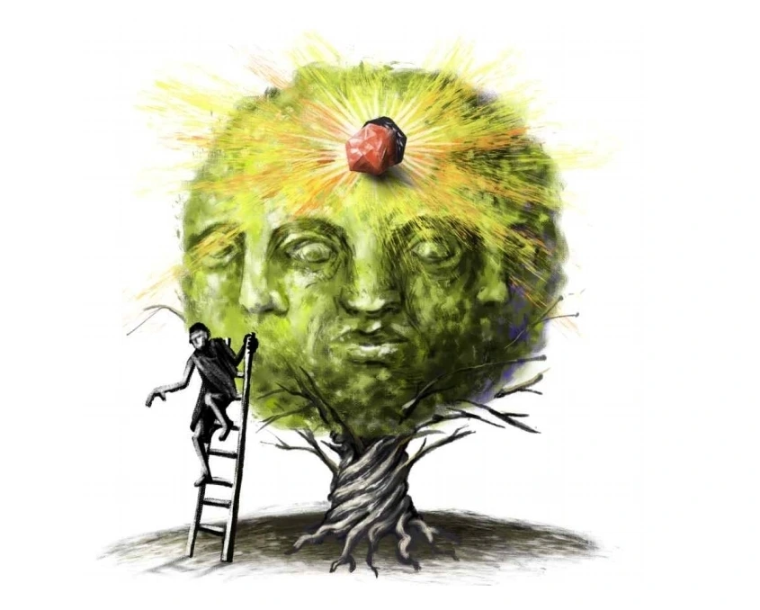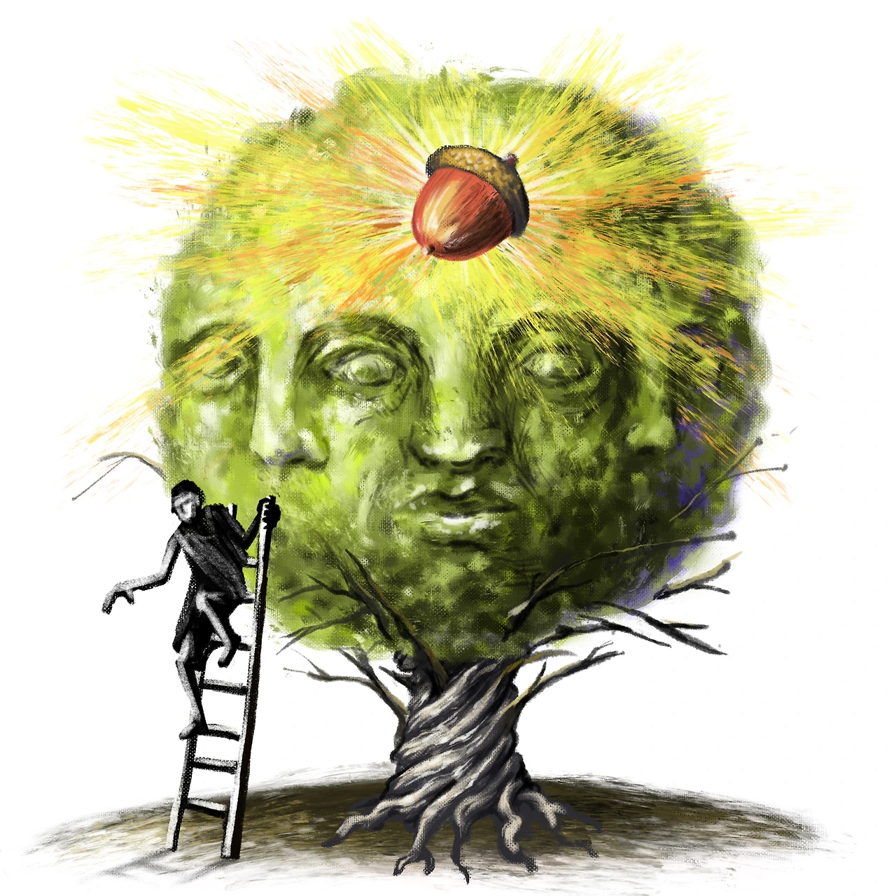 추상 그림의 나무속 사람 얼굴은 독배를 든 소크라테스를 상징하기도 하며 대전제와 소전제를