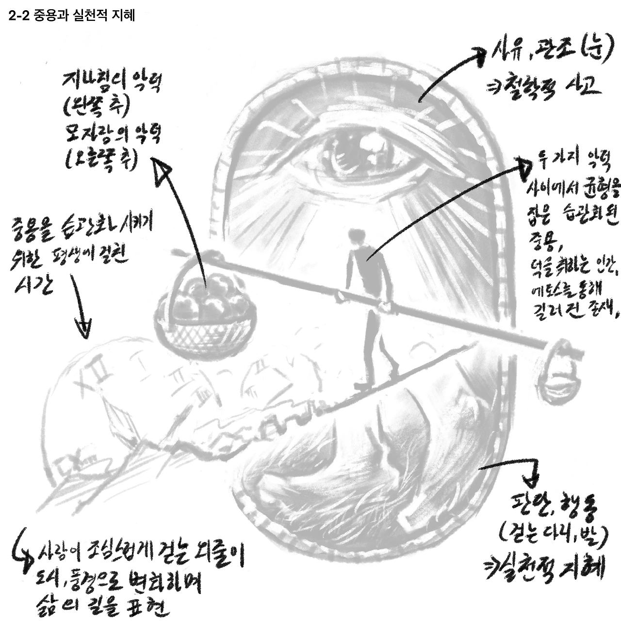 지긋한 눈동자가 사유와 관조하는 철학적 삶을 의미하는 듯하다. 한 사람이 걸어가는 길은 인생길을 의미하는듯하고,손에 든 막대 한쪽에는 가득 찬 바구니와텅 비어있는 바구니가 걸려있다. 중용은 지나침과 모자람 사이에서 균형을 맞추어야 하는