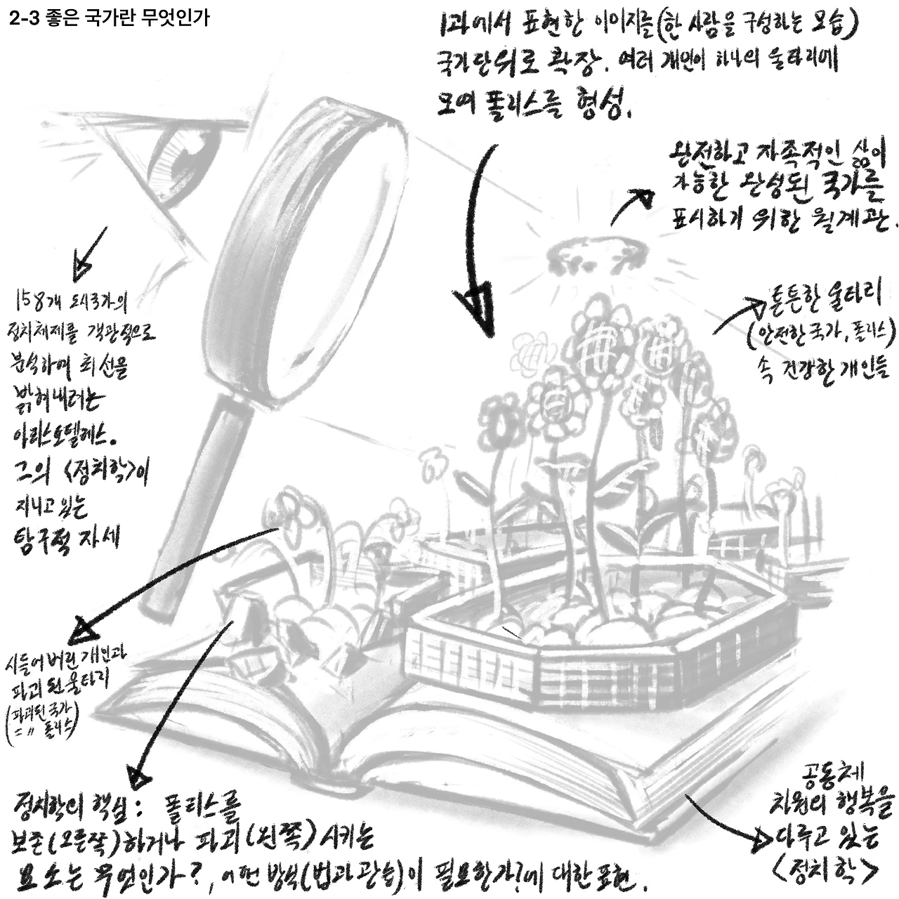 『정치학』의 핵심은 폴리스를 보존하거나 파괴하는 요소가 무엇이고, 폴리스 통치의 훌륭한 형태와 타락한 형태는 무엇이며, 최선의 정치 체제에서는 어떤 법과 관습이 필요한가 하는 것입니다. 개인이 행복한 삶을 누릴 수 있도록 해주는 정치 체제의 조건을 찾는 것이야말로 ‘넓은 의미의 정치학’의 목적이지요.