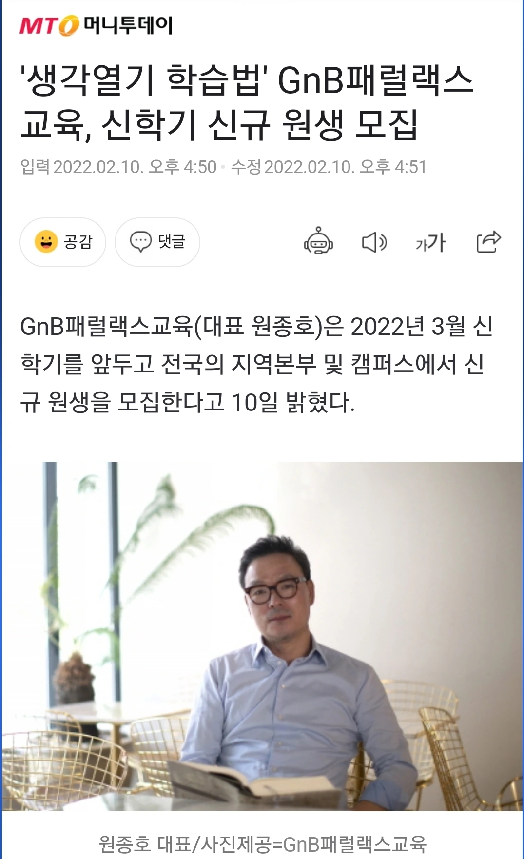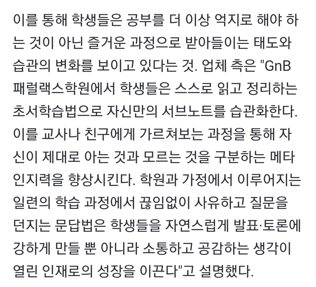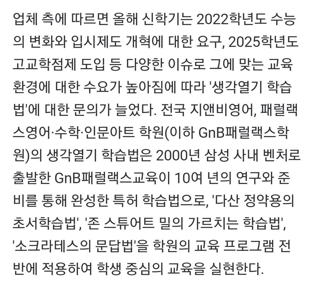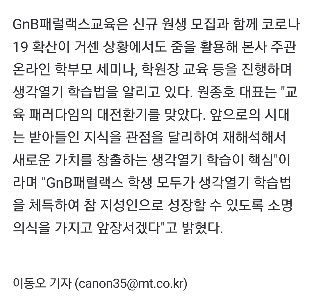 '생각열기 학습법' GnB패럴랙스 교육,신문기사