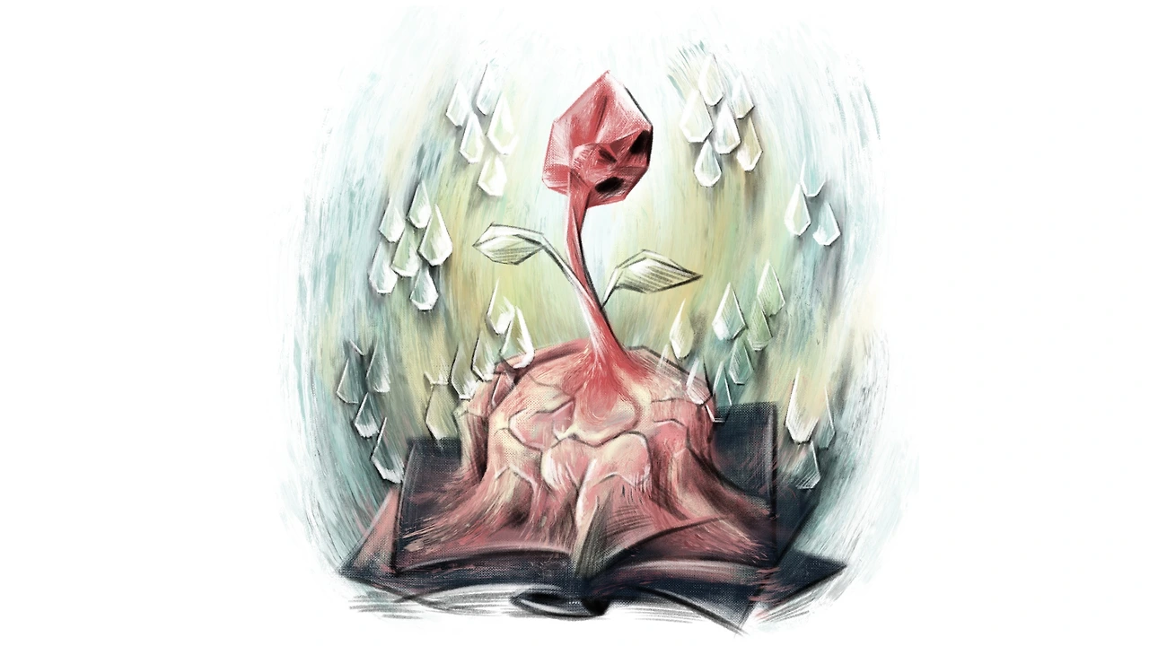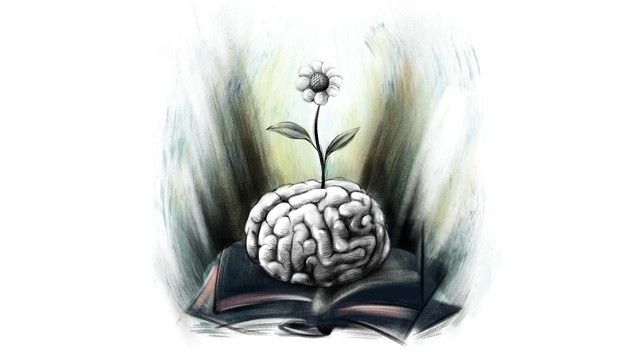책 위에 지혜의 뇌에서 꽃이 피어나고 있다.