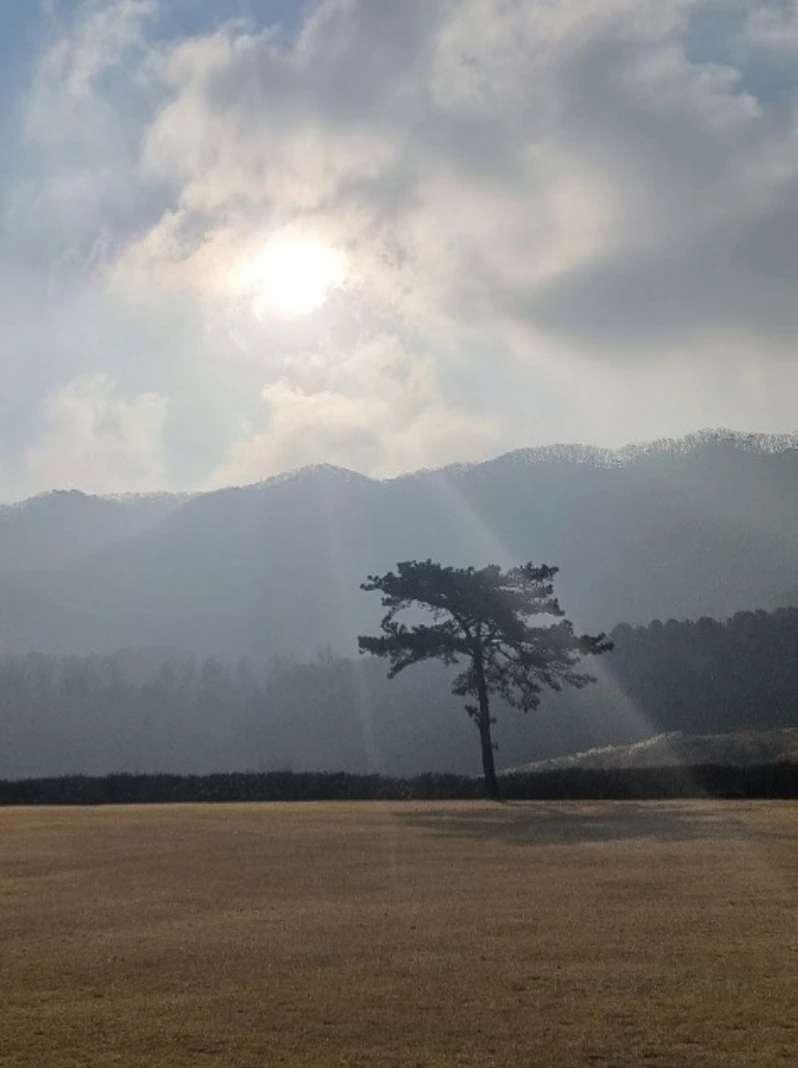 Plato Won 作,구름 사이로 햇살이 고독스럽게 서 있는 소나무에 한줄기 볕으로 달려간다.
