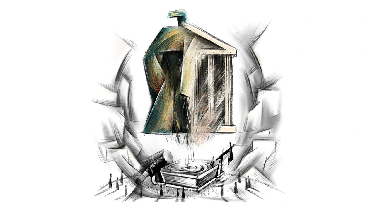 각종 법전이 펼쳐져 있고 사람들의 모습은 법전보다