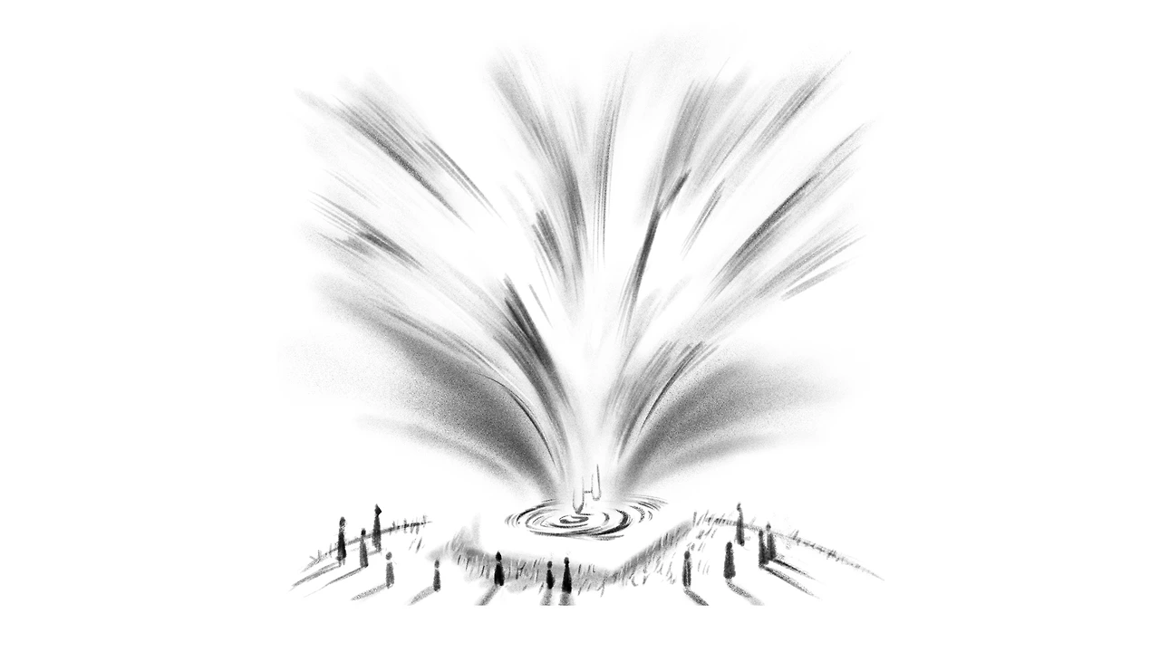 그림 중앙의 언덕은 그리스 아테네의 폴리스 국가를 상징하고 그 속에서 솟아 오른 휘오리 바람은 타락한 정치체제와 한줄기 희망의 빛을 동시에 의미하고 있습니다.