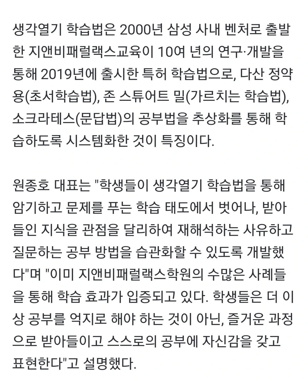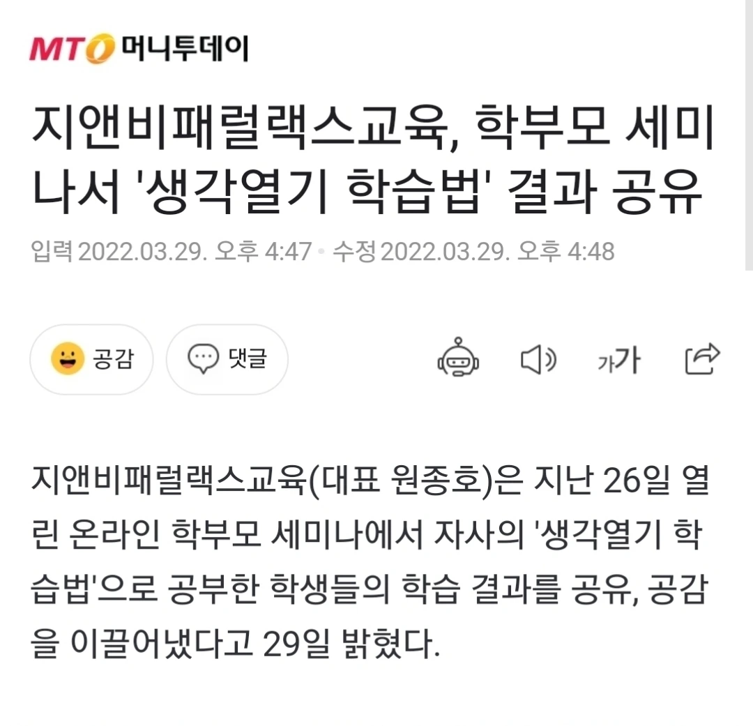 교육뉴스,생각열기 학습법,지앤비패럴랙스교육