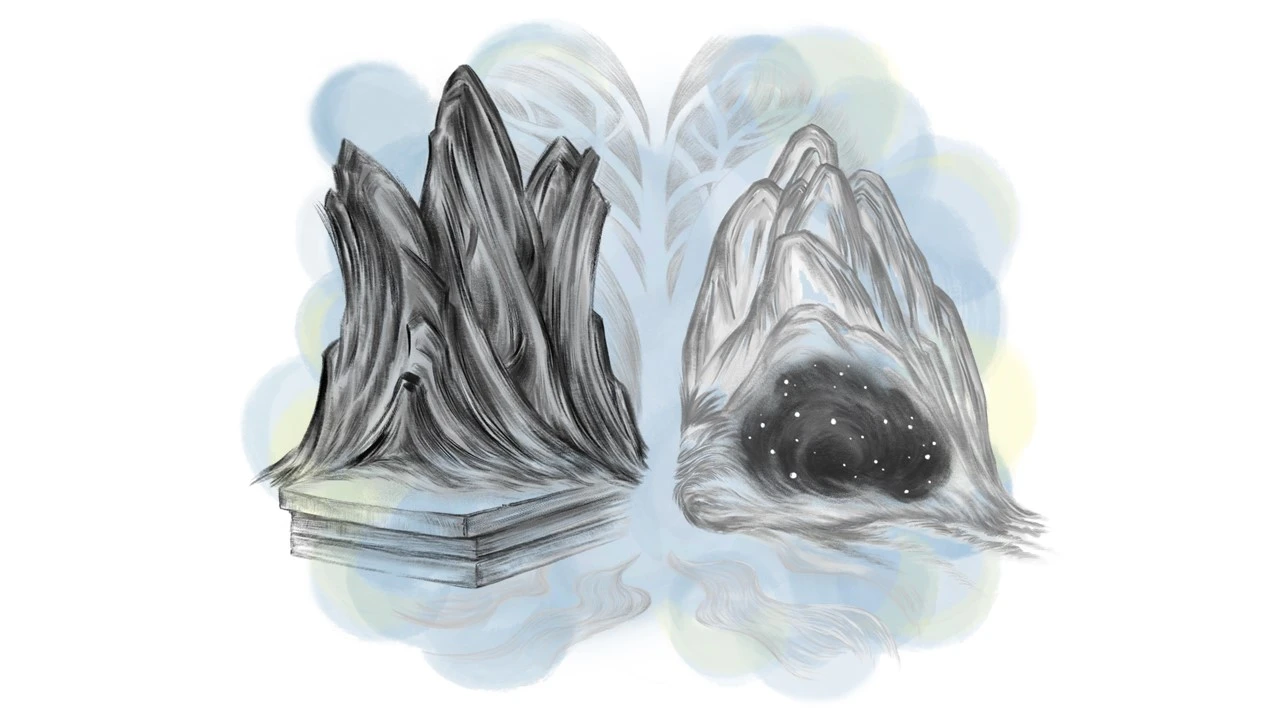 반면에 원만한 곡선으로 된 오른쪽 산은 노자와 도가를 상징합니다.어둠과 빛이 공존하는 동굴에서 보듯,