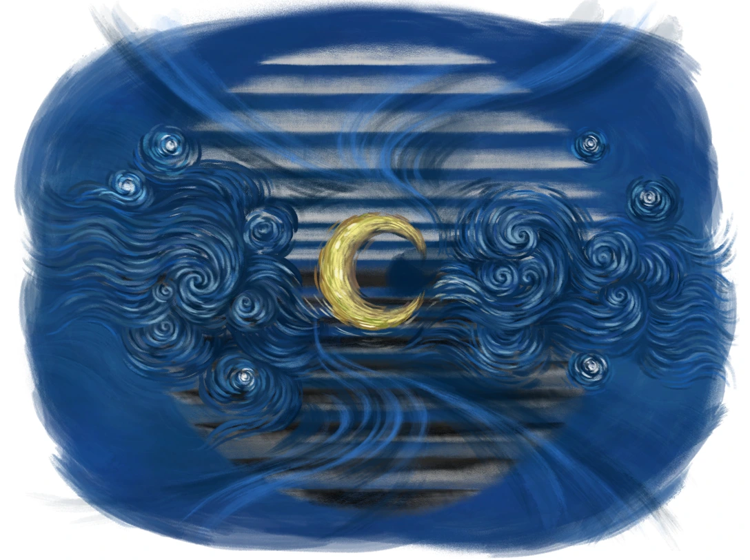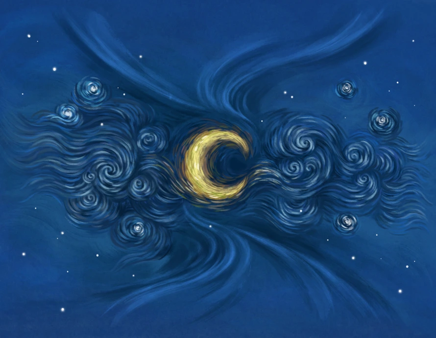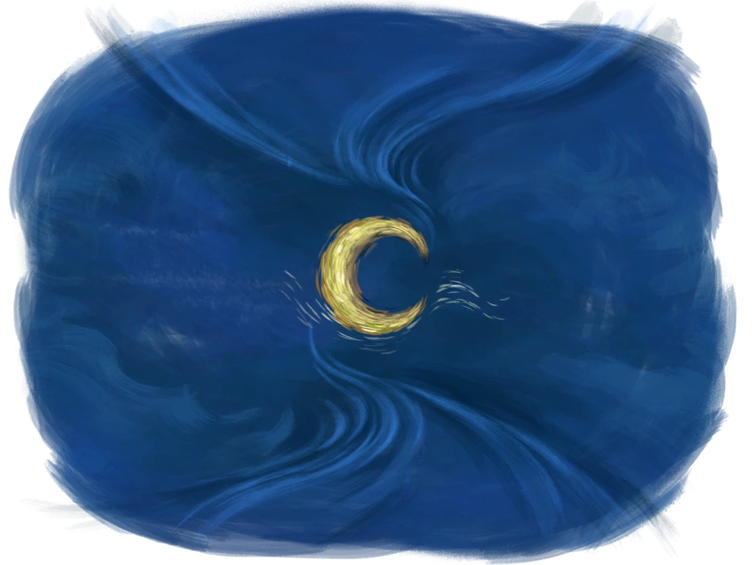 무수한 별들 속에 황금색의 초승달이 밝게 빛나고