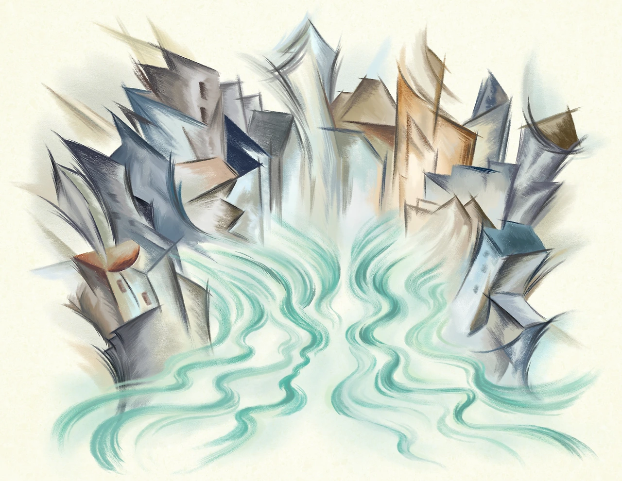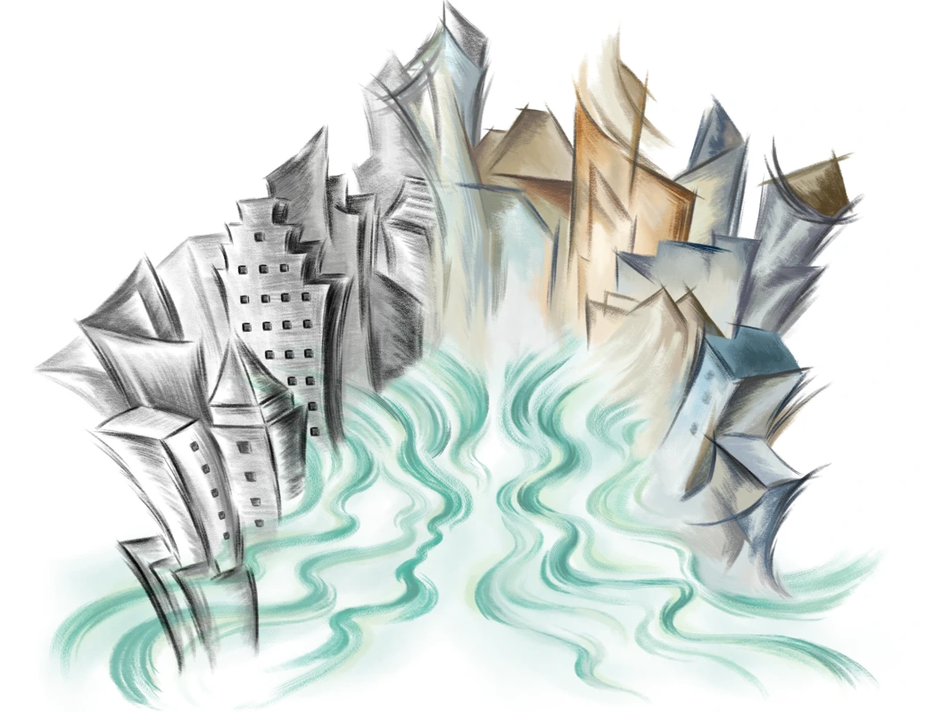 물이 높은 곳에서 낮은 곳으로 흘러내리고 빌딩숲