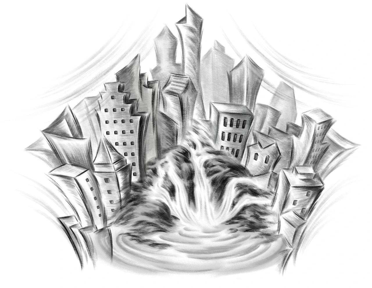 물이 흘러내리는 뒷배경이 서서히 빌딩숲에서