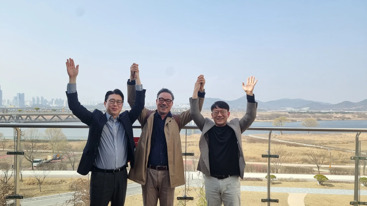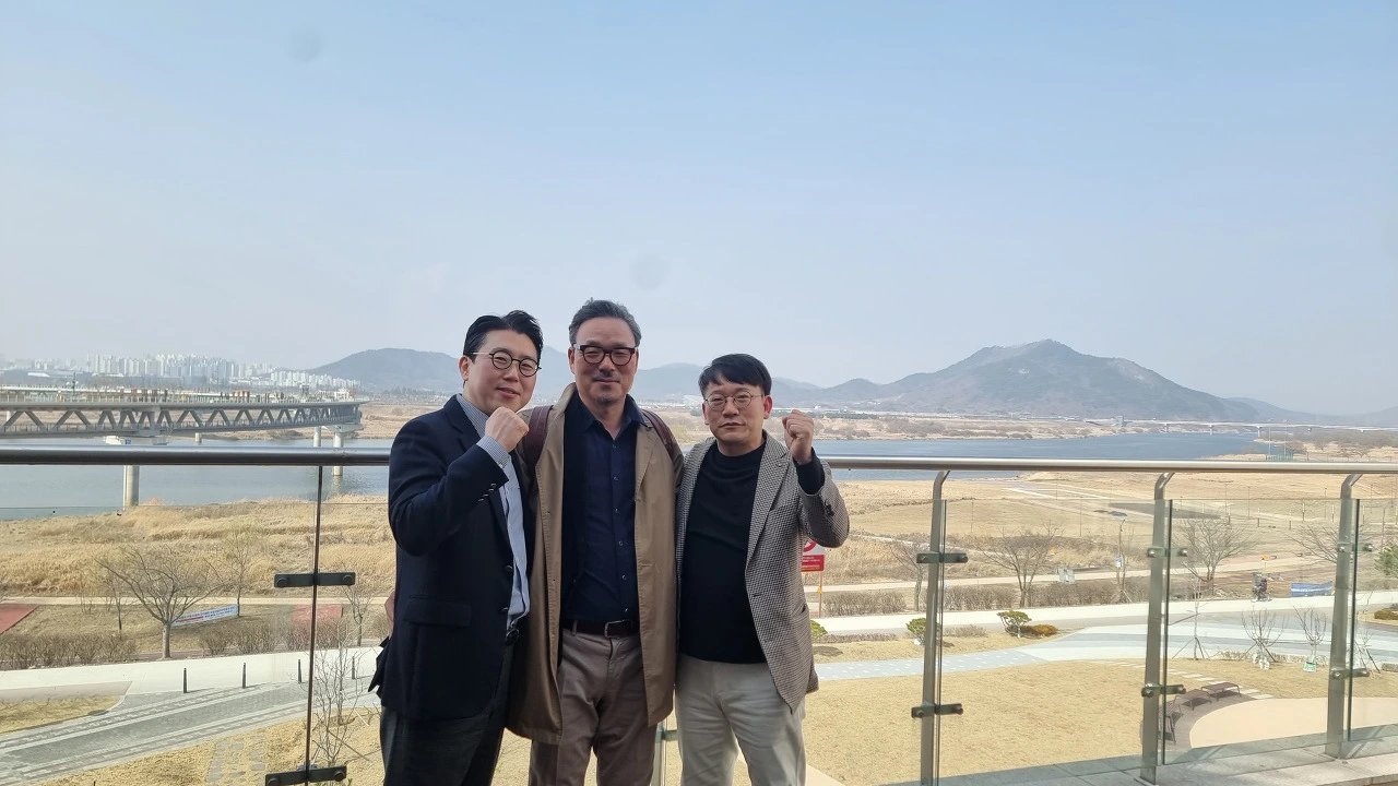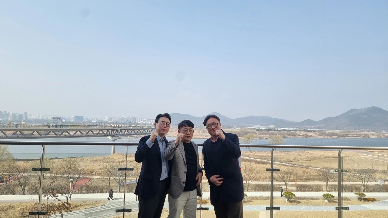 세종 충남본부 학원장 교육 후 금강을 배경으로 김보환 본부장과 유민우 국장,조현경 팀장과 한 컷