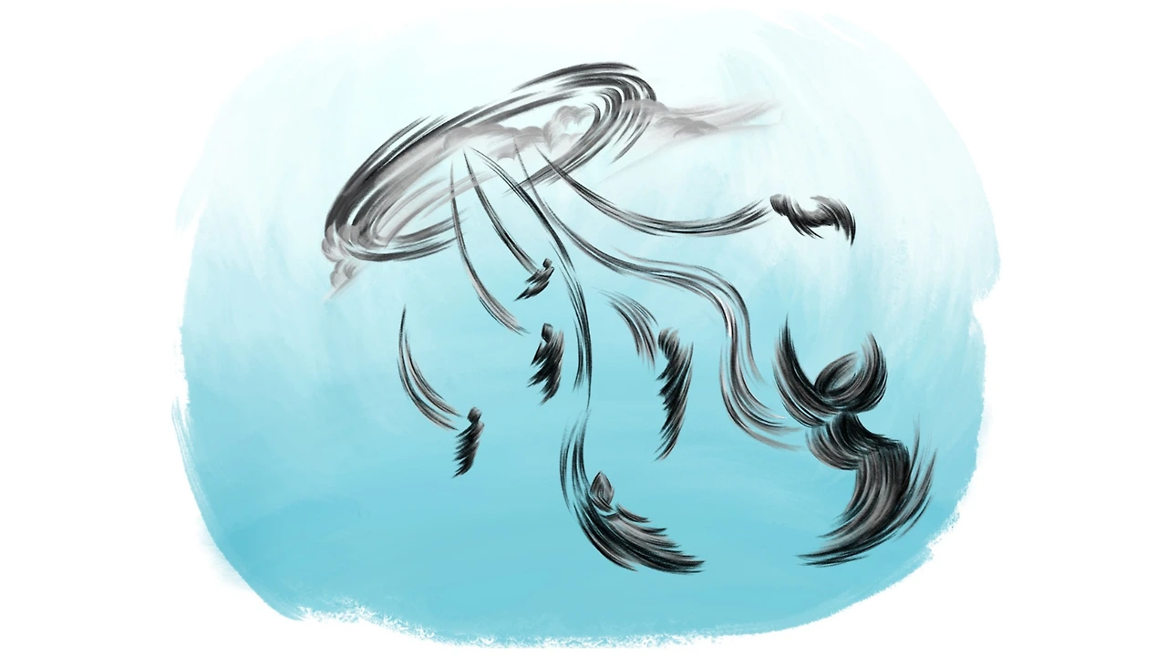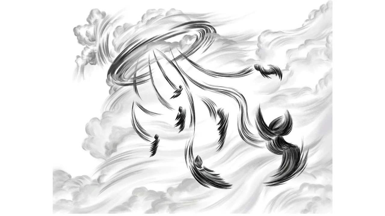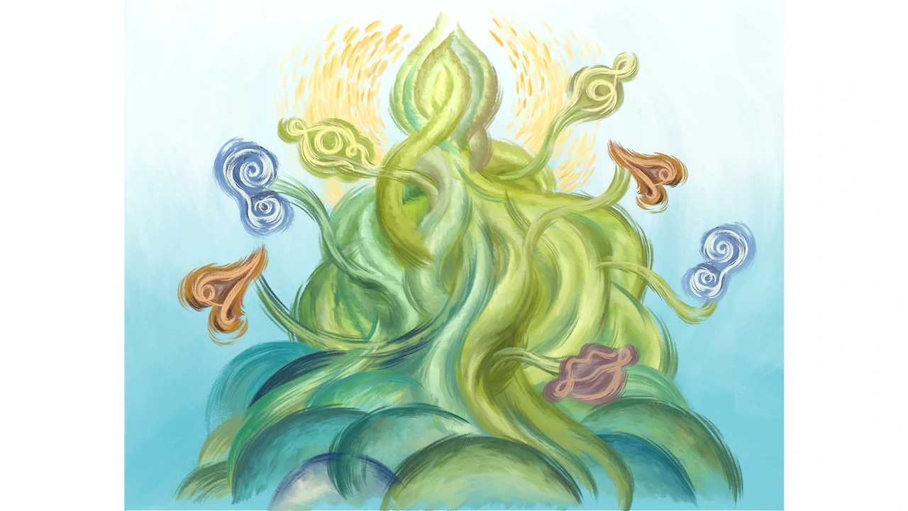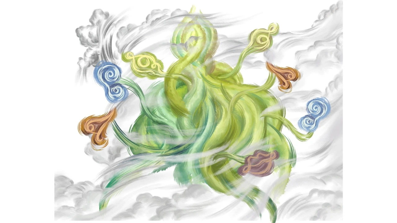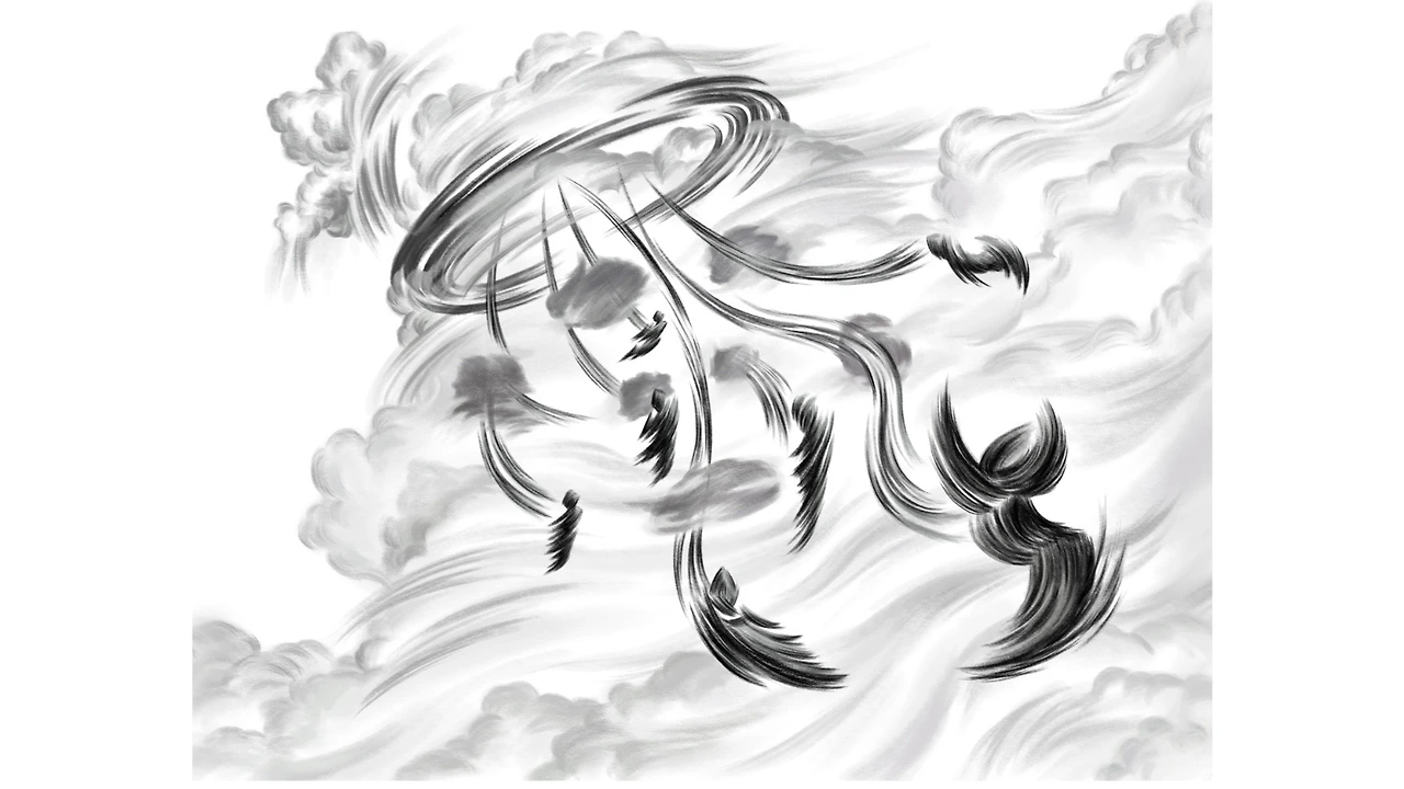 -구름의 형상은 하늘로 솟아 오른 긴 생명의 줄기로 변화했습니다. 구멍이 있던 자리에 눈,코, 입 ,귀를 추상화한 감각 기관 줄기들이 뻗어져 나와 자라납니다.