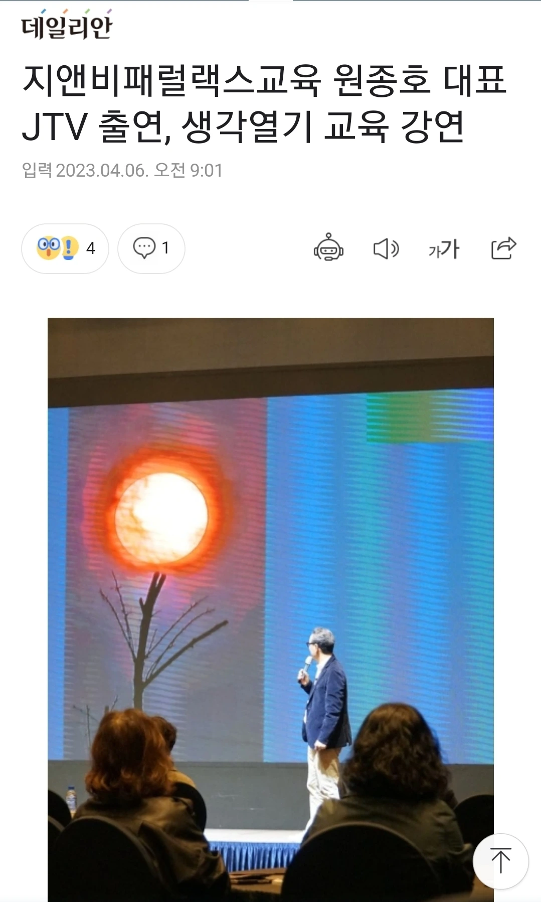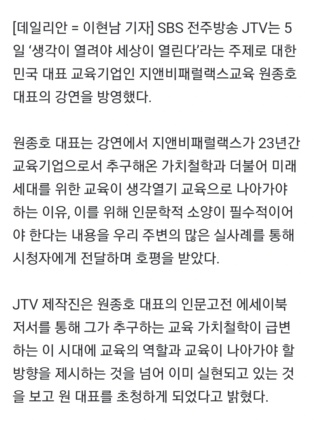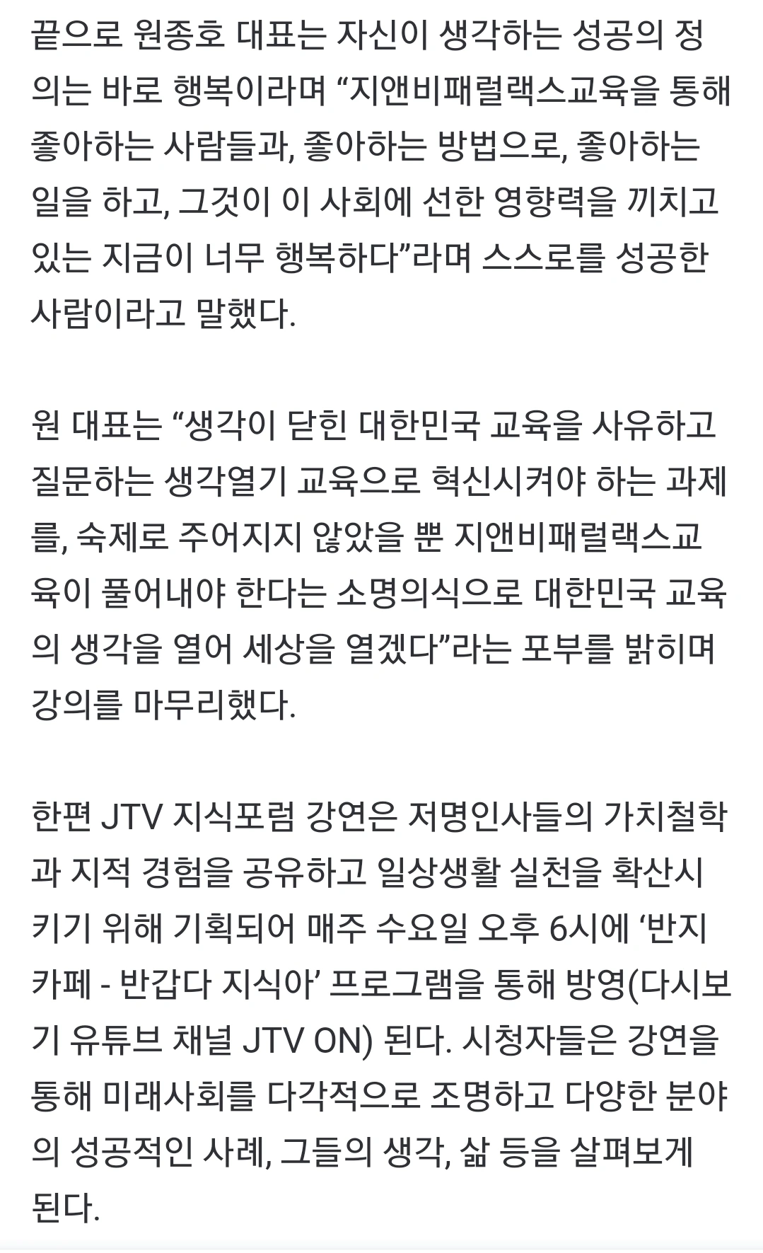 JTV ,생각열기 교육 강연 신문기사