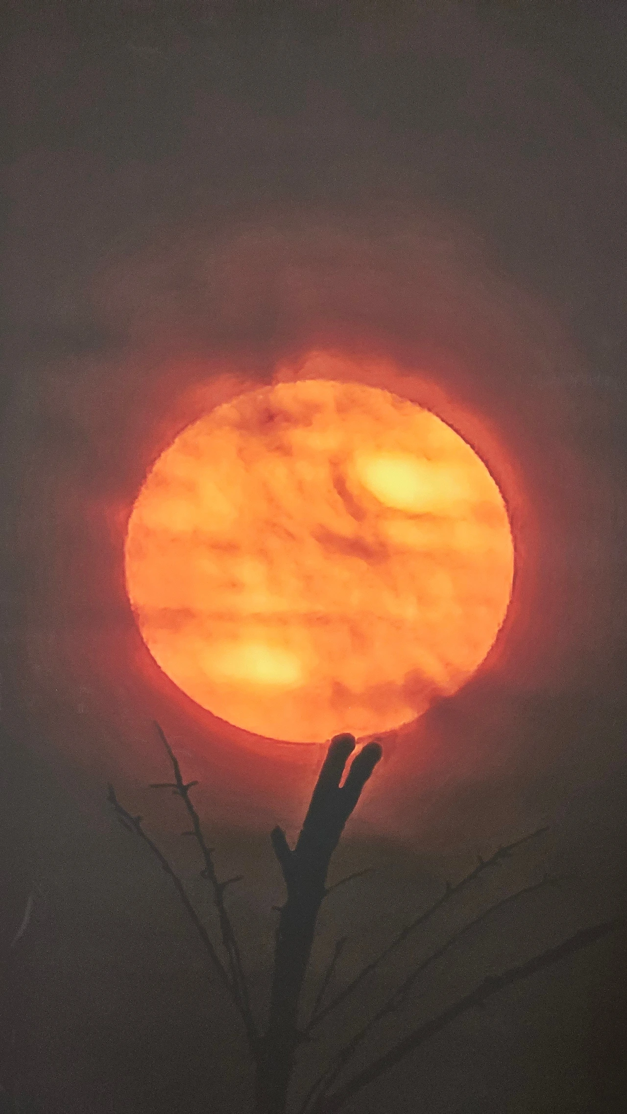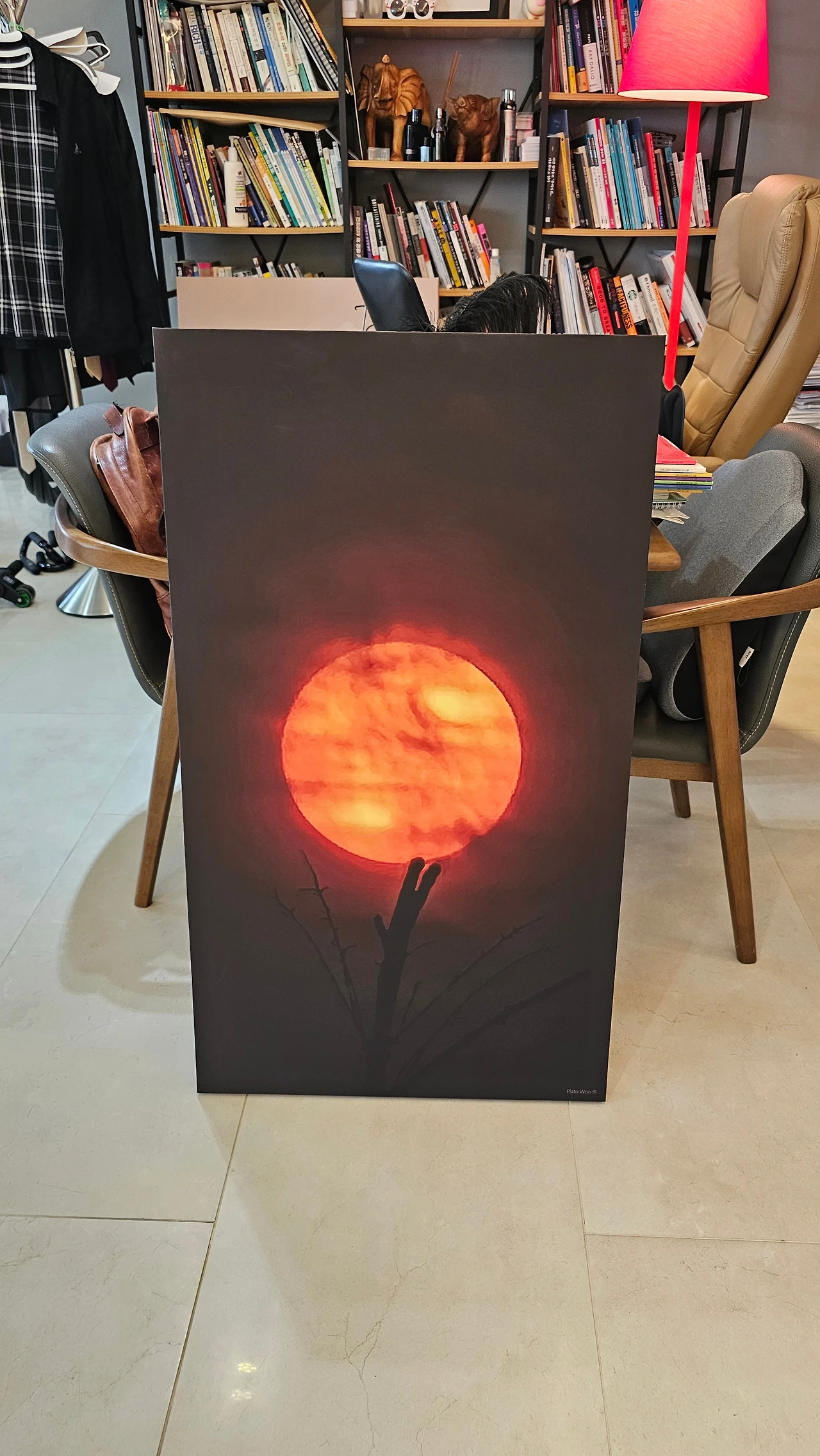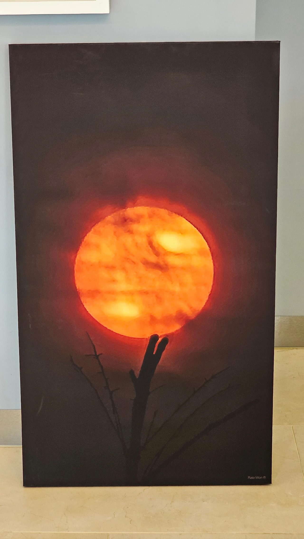 Plato Won 作,새벽 출장길 스마트폰으로 순간 포착한 나무가지 위 여명 사진,현묘해서 실사 출력했다.