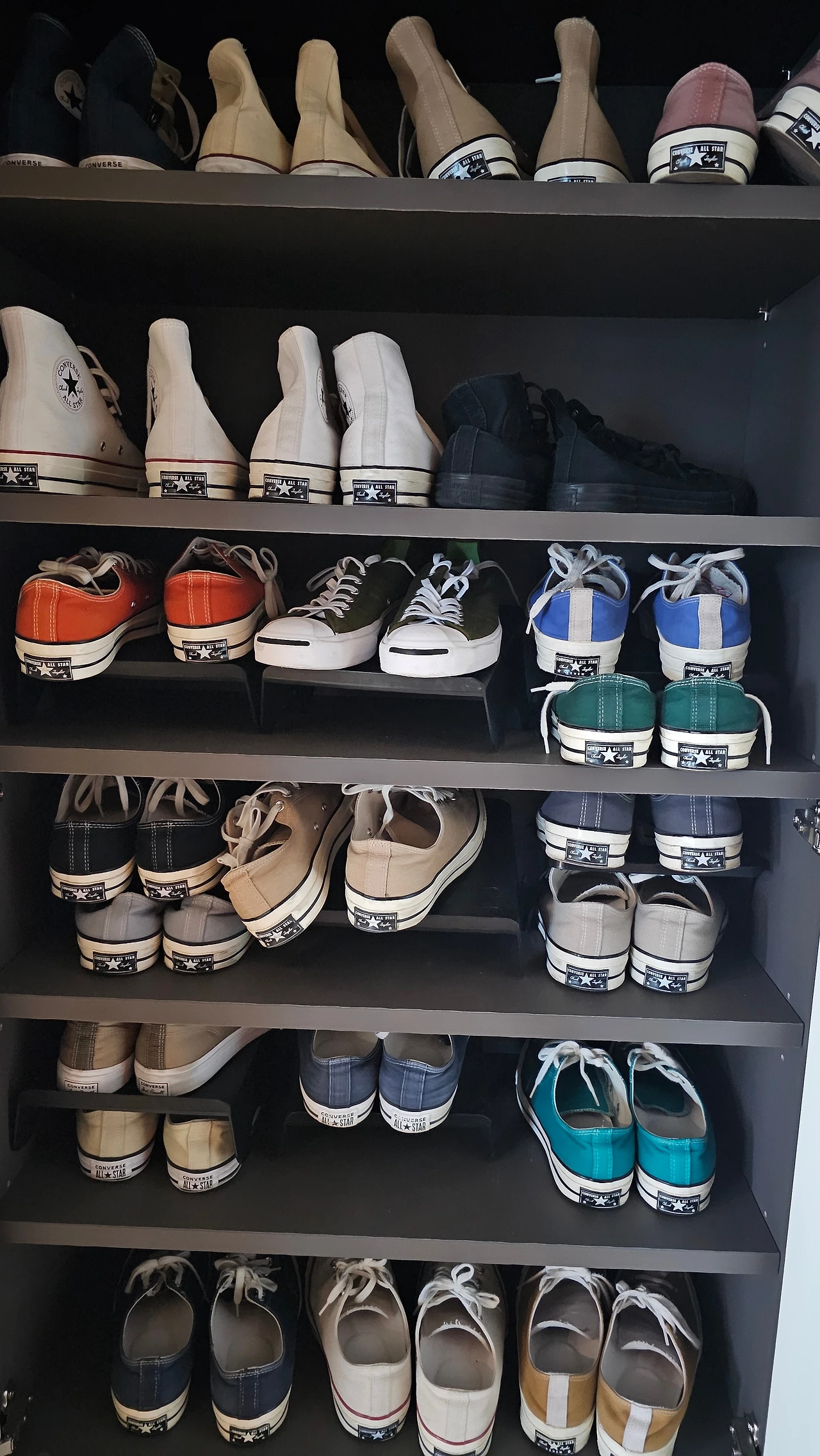 색깔별로 30켤레가 넘는 캔버스를 돌려가며 신는다.