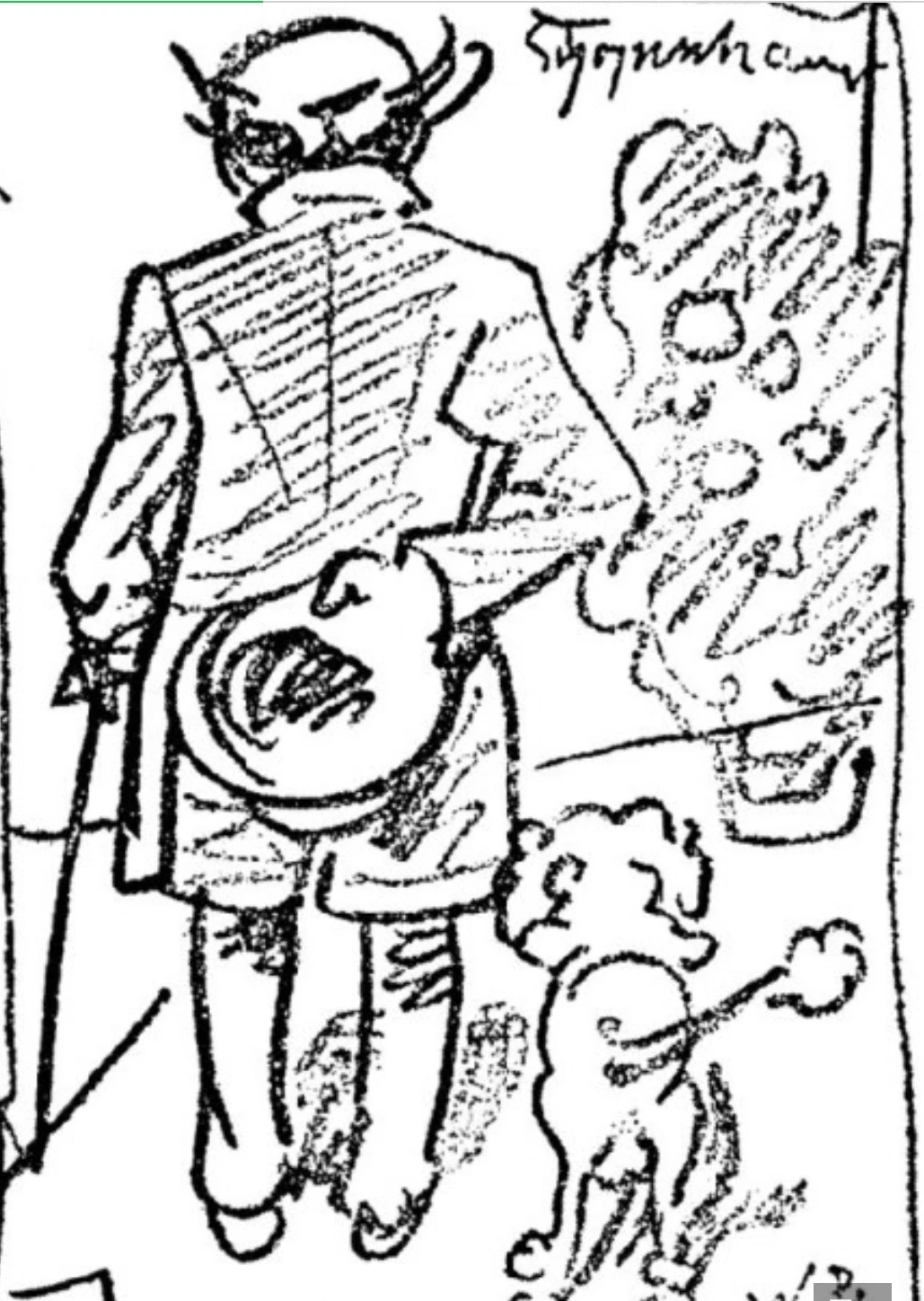 반려견과 산책하는 쇼펜하우어 스케치,쇼펜하우어는 실제 헤겔의 철학을 자신이 키우는 개만도 못한 철학이라고 맹비난한 철학자이기도 하다.