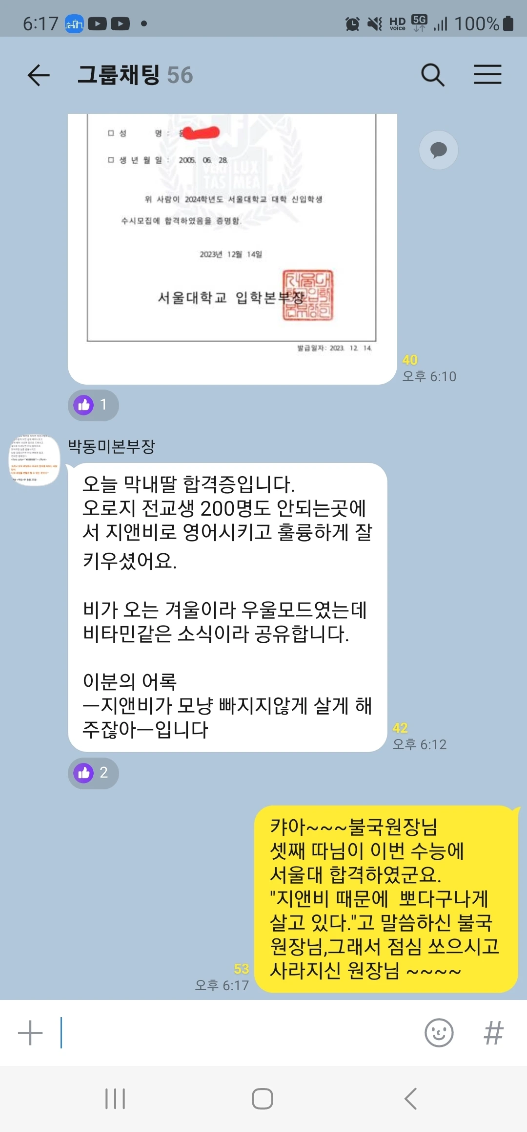 수시합격 했다고 또 감사의 인사를 보내왔다.
