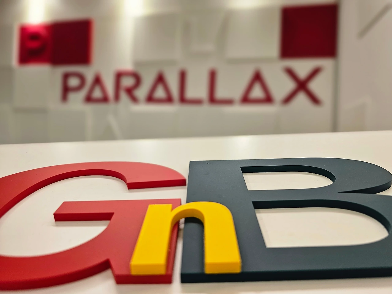 지앤비패럴랙스의 붉은 로고가 안개 자욱한