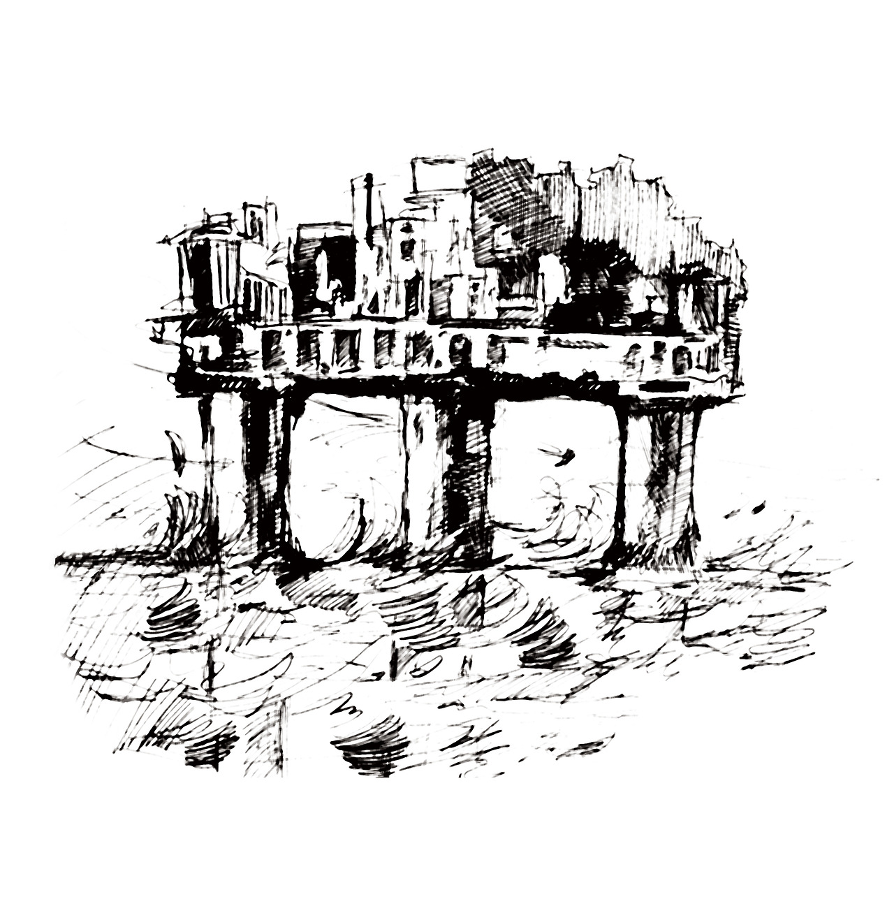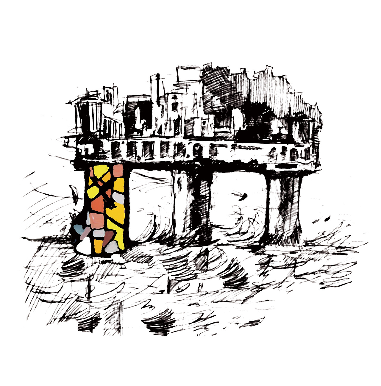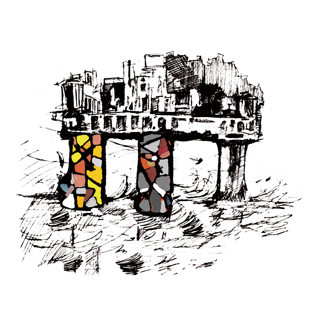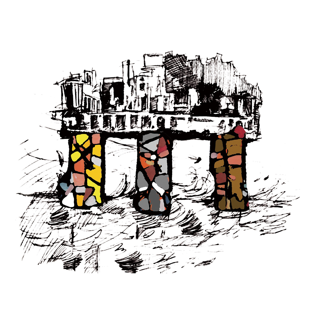 추상 그림에서 신전을 받치고 있는 기둥은 비스듬히