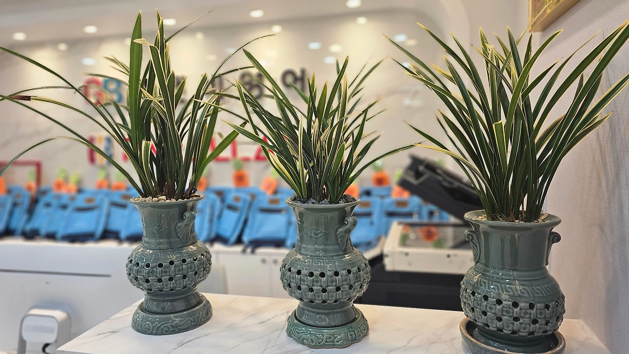 석산 캠퍼스 개원 기념으로 난을 선물하였는데,문 원장님께서 氣를 받겠다고 똑같은 난을 두 개 더 준비하셔서 철학에서 완벽한 數 ,석 三을 만들어 열정과 의지을 심어놓어셨다.^^