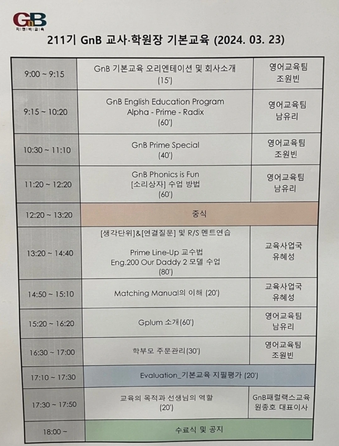○ 오늘은 제 211기 지앤비패럴랙스 영어