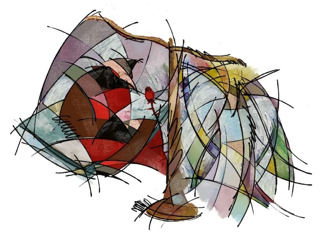 악마의 대변인과 천사가 무게추인 천칭을 사이에 두고 치열한 토론을 펼치는 모습,토론의 중요성을 추상화로 스케치한 그림