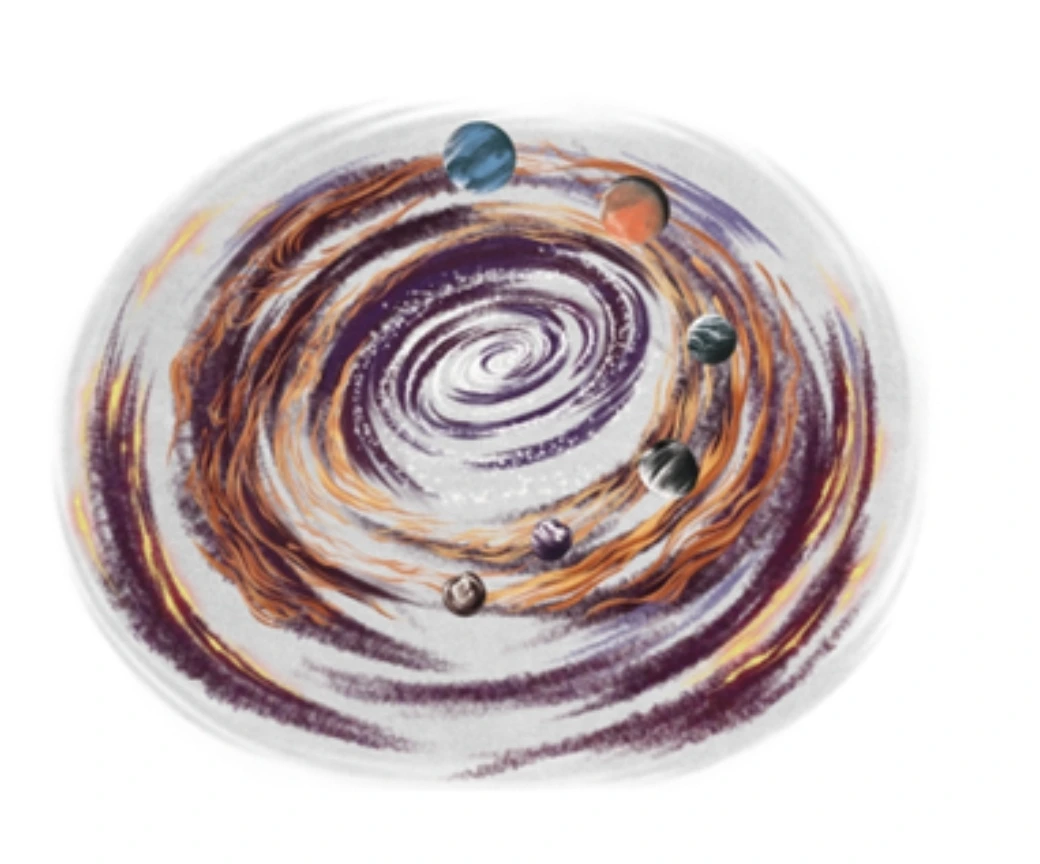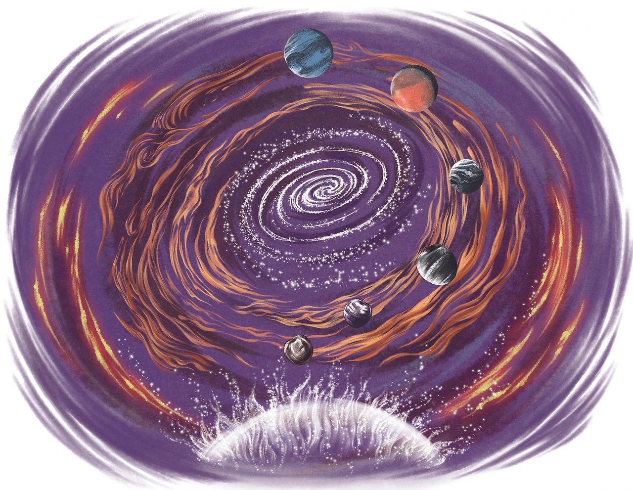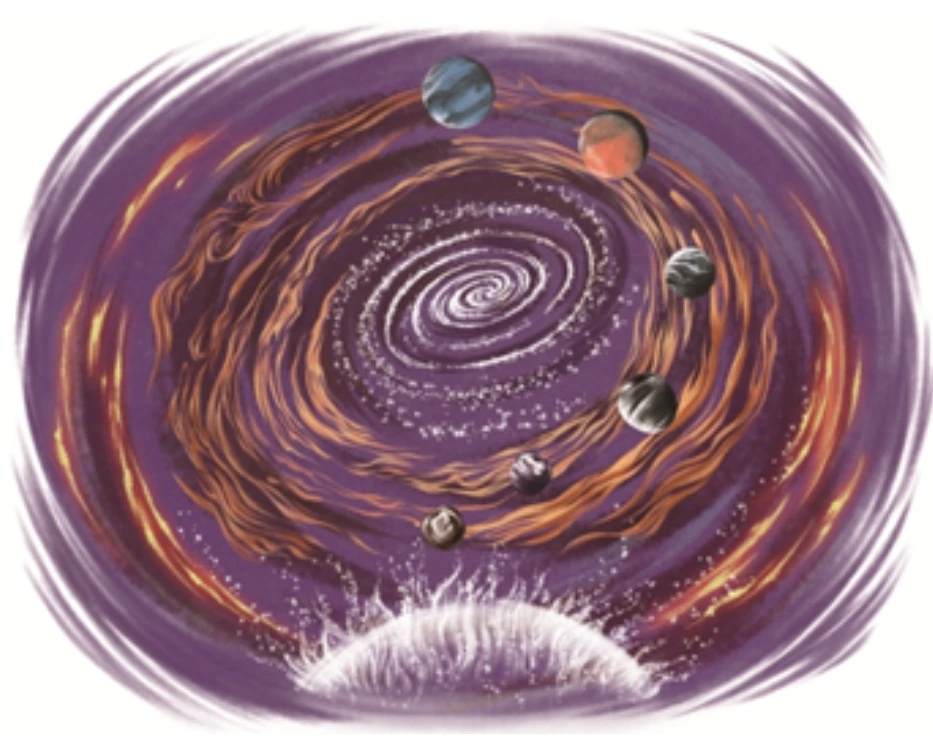 그림의 이글거리는 태양이 어두운 우주를 비추면서