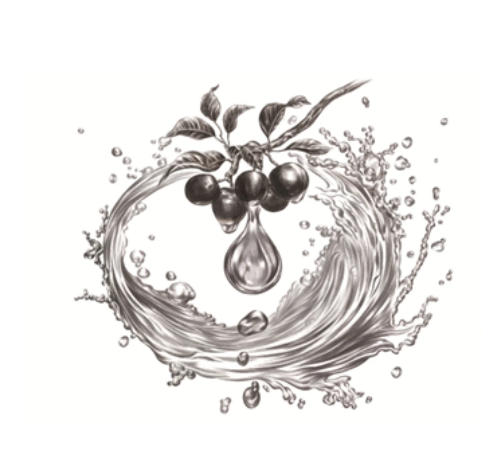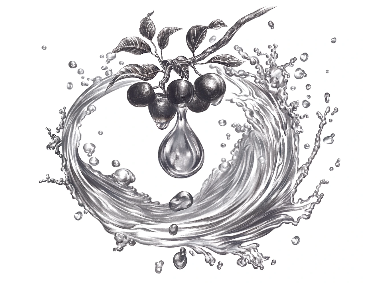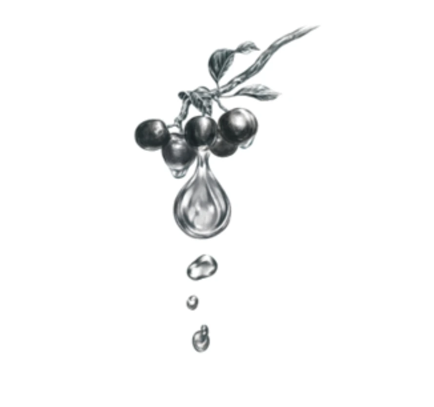 나뭇가지에 열매가 열려 있고 물방울이 떨어지고