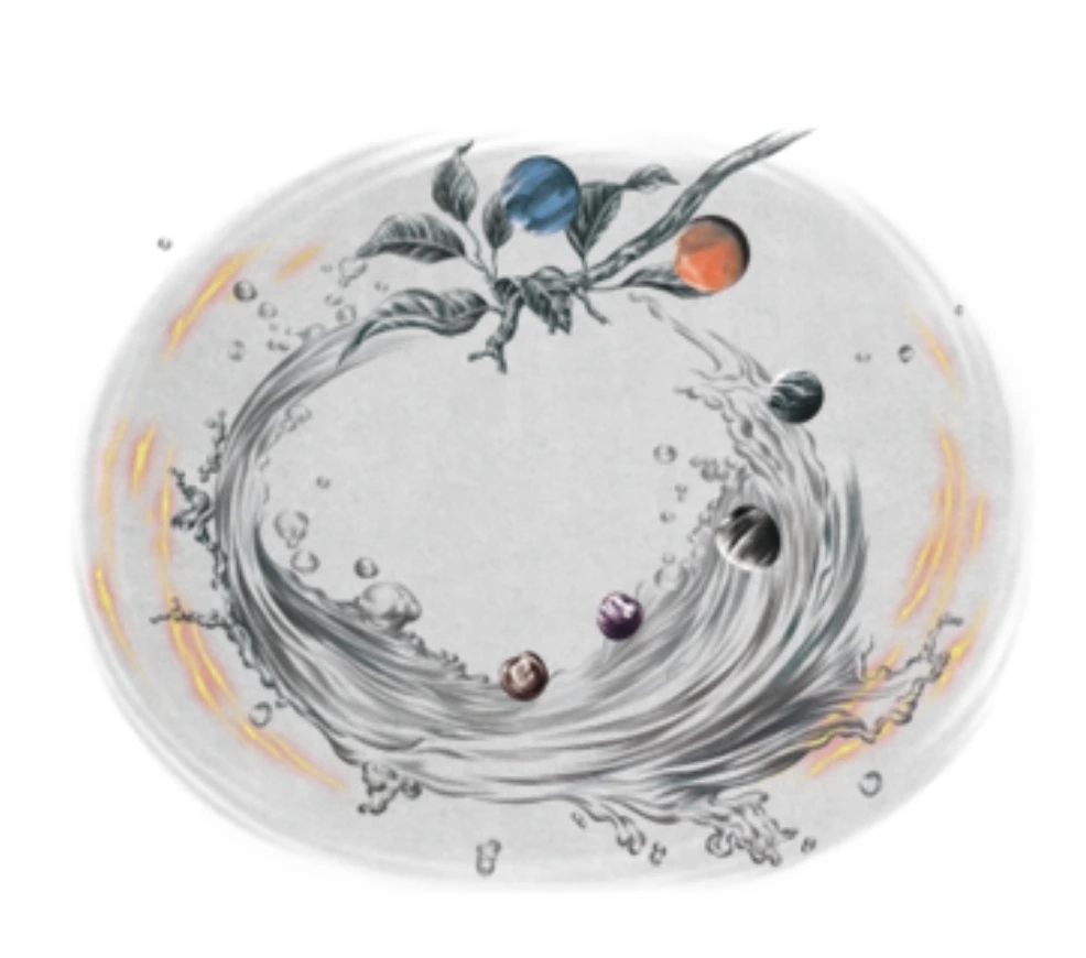 만유인력을 상징하는 열매들 주위로 바닷물이