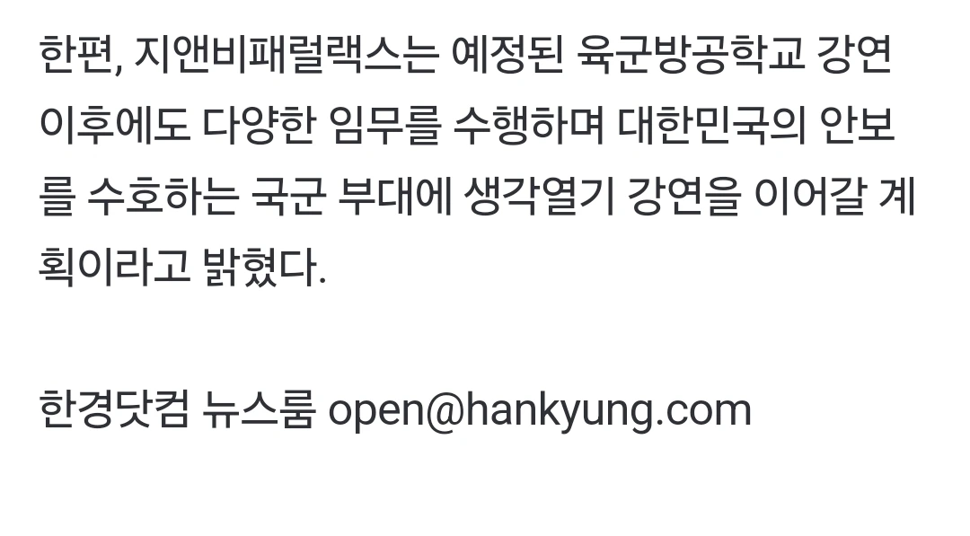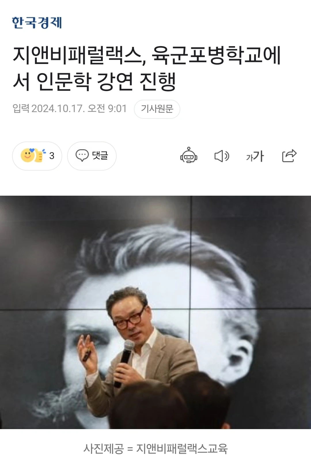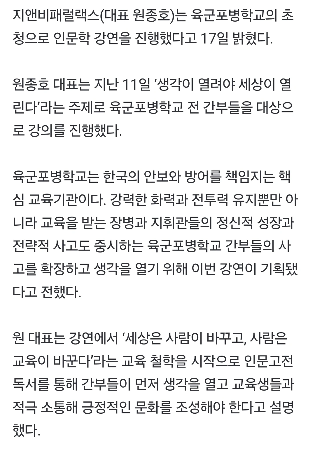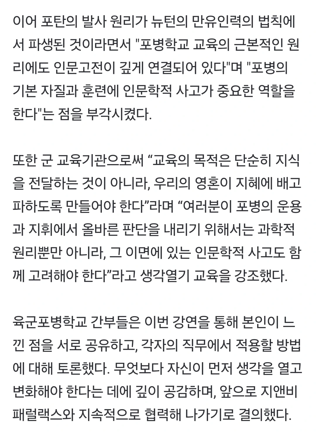 지앤비패럴랙스,육군포병학교에서 인문학 강연