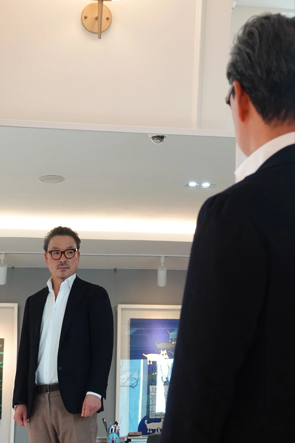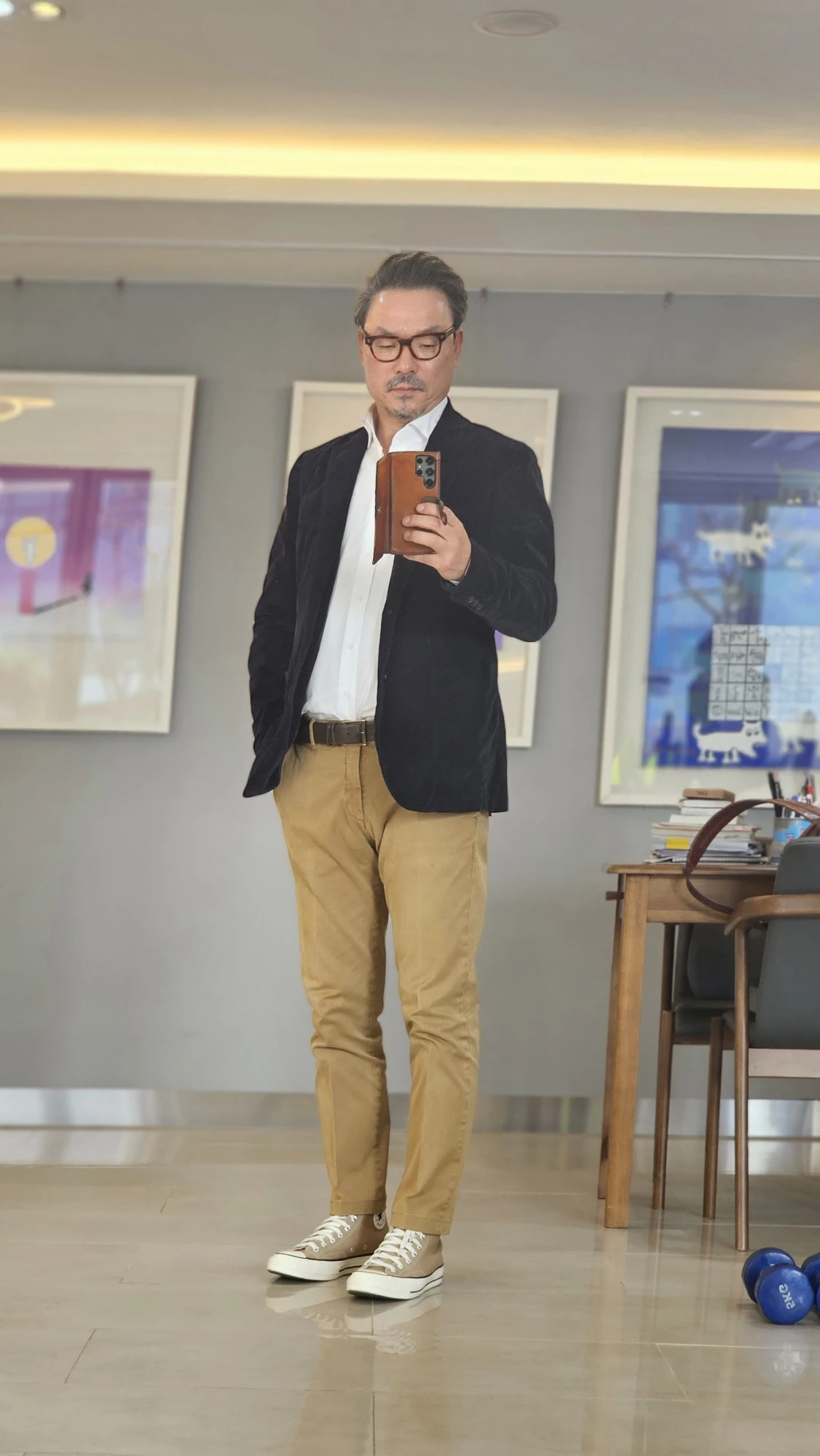 주로 입고 상의는 네이비 재킷이나 바지보다 짙은 색을 주로 입는다.