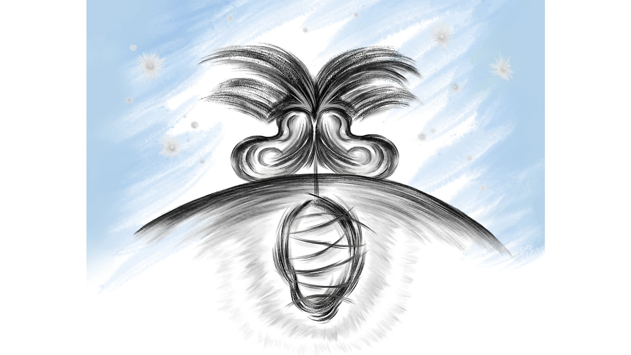 땅의 둥근 면을 경계로 아래쪽에는 누에고치,