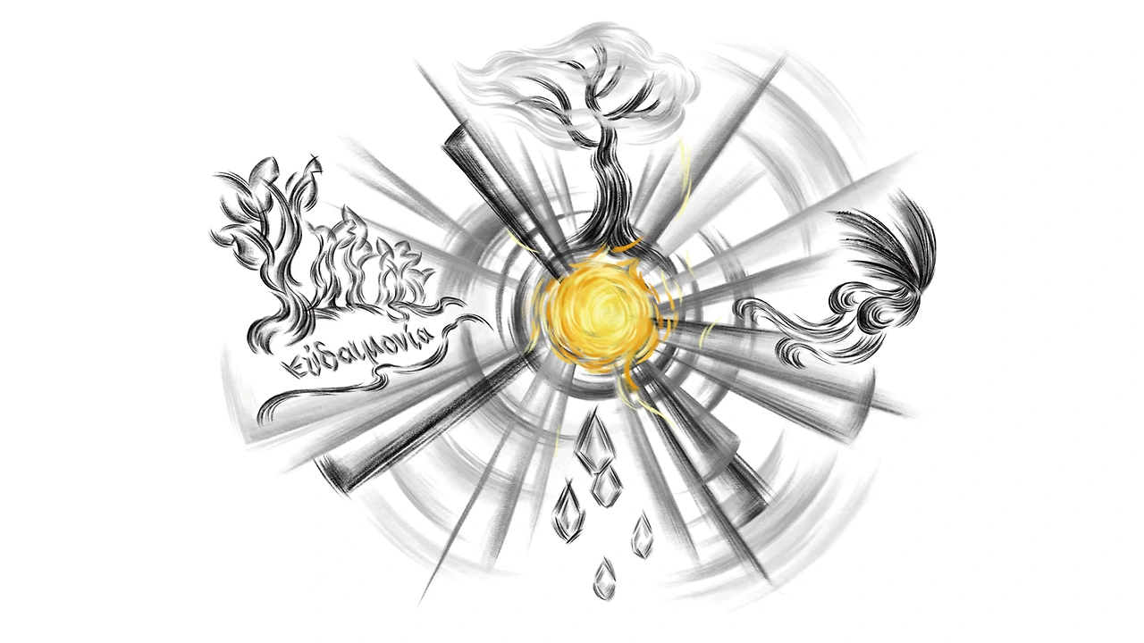 12시 방향의 나무는 플라톤의 ‘좋음의 이데아’를, 9시 방향의 숲과 그리스 글자는 숲 속을 거닐며 사유했던 ‘소요학파’ 아리스토텔레스의 면모, 그가 말하는 참된 행복인 ‘에우다이모니아’를 형상화한 것입니다.