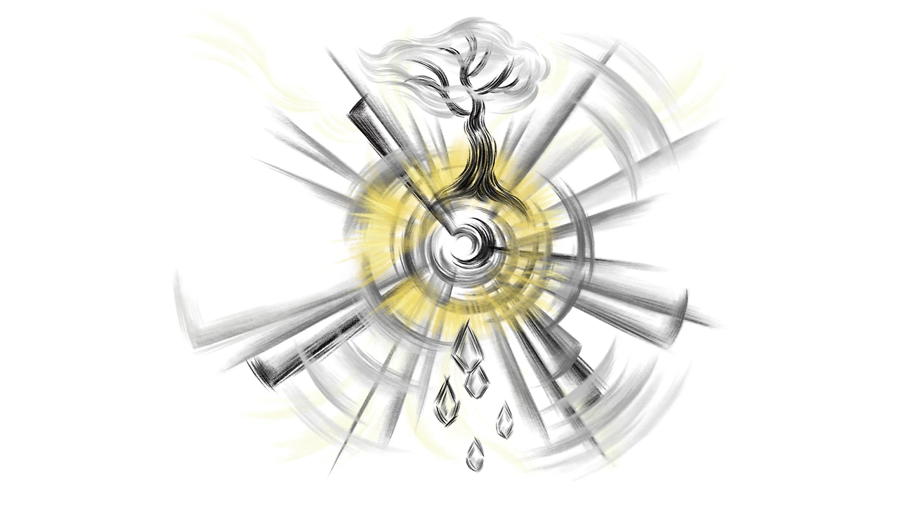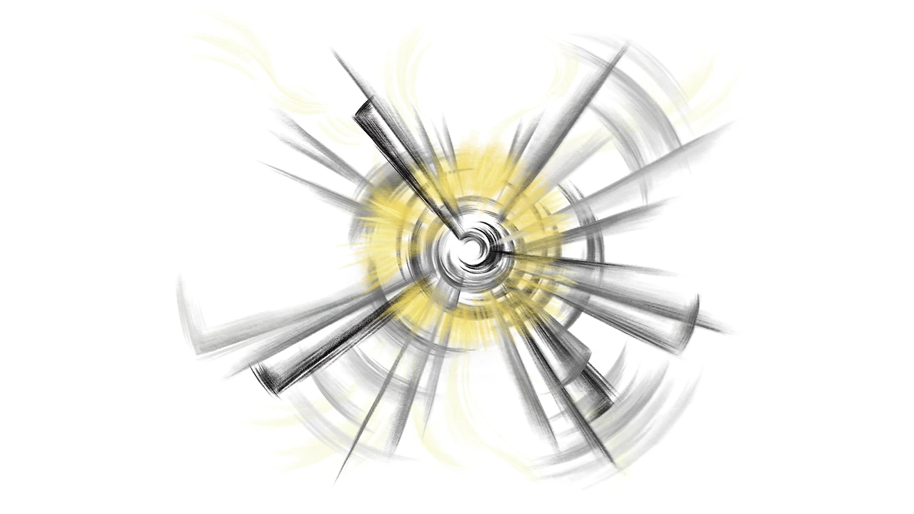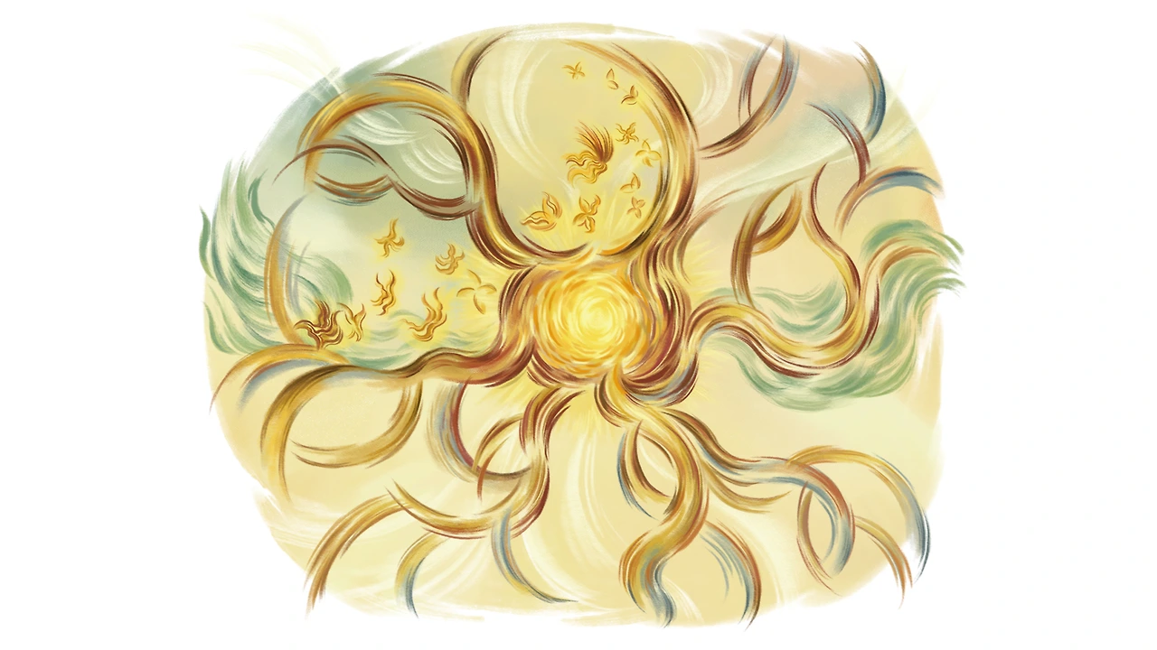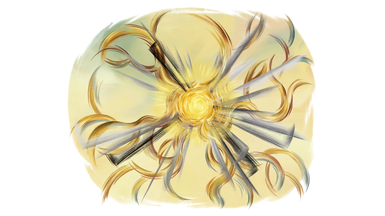중심부가 마치 태양과도 같은 강렬한 빛을 내뿜자, 곡선들은 훨씬 더 큰 궤적을 그리며 넓어졌습니다.