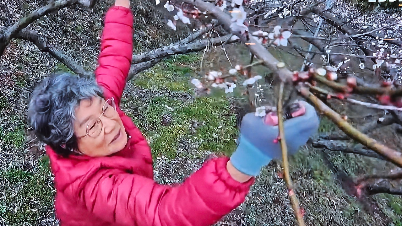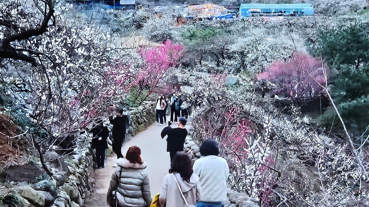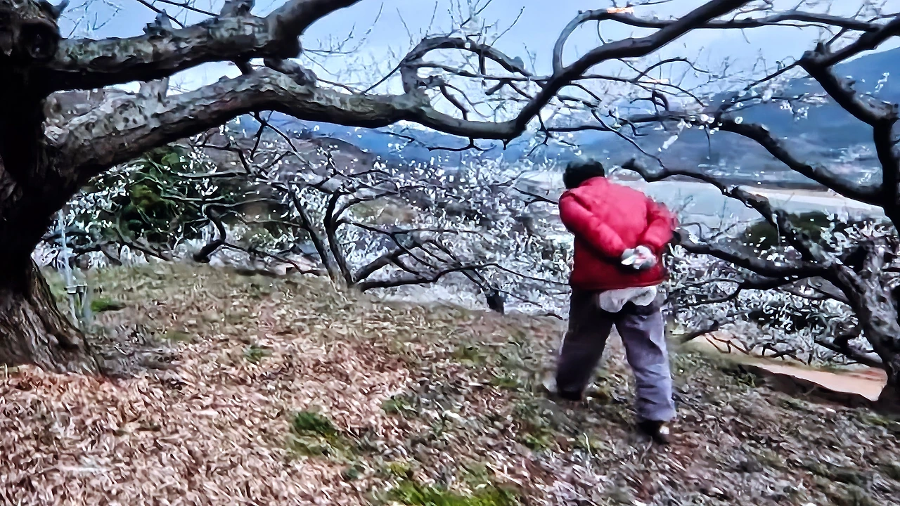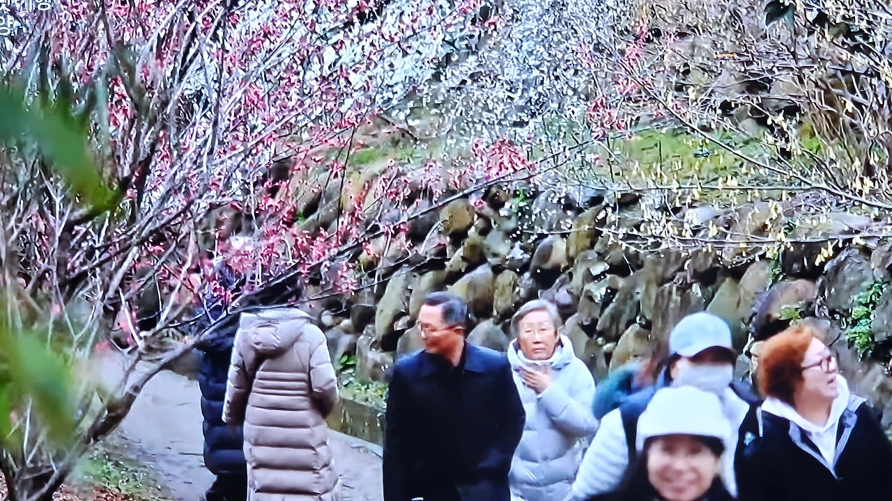 자신이 가꾼 매화마을을 걷는 홍싸리 할머니