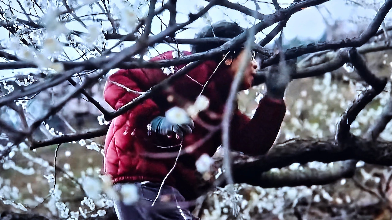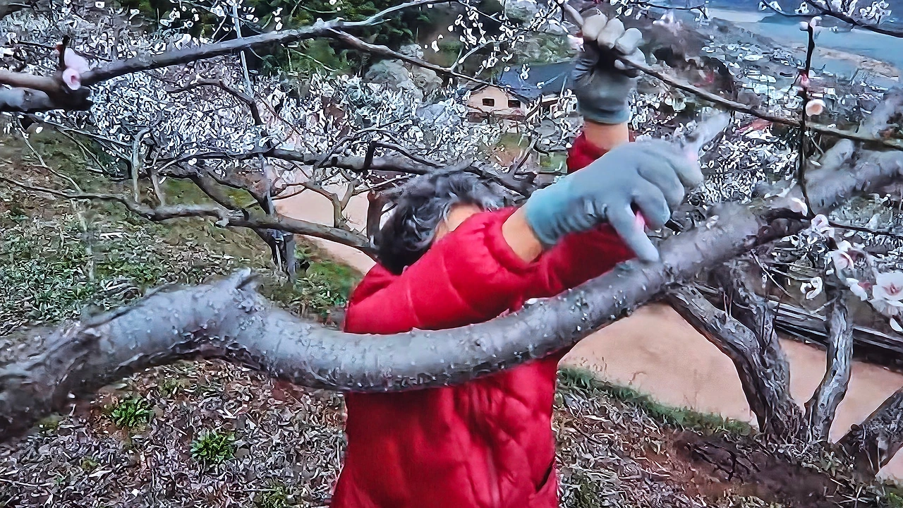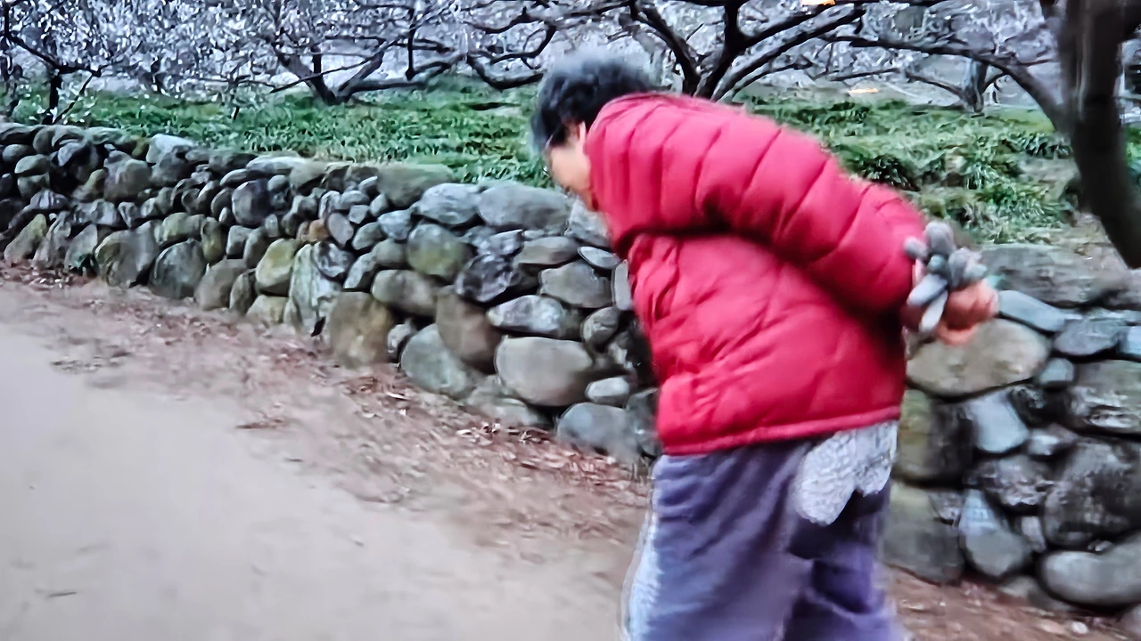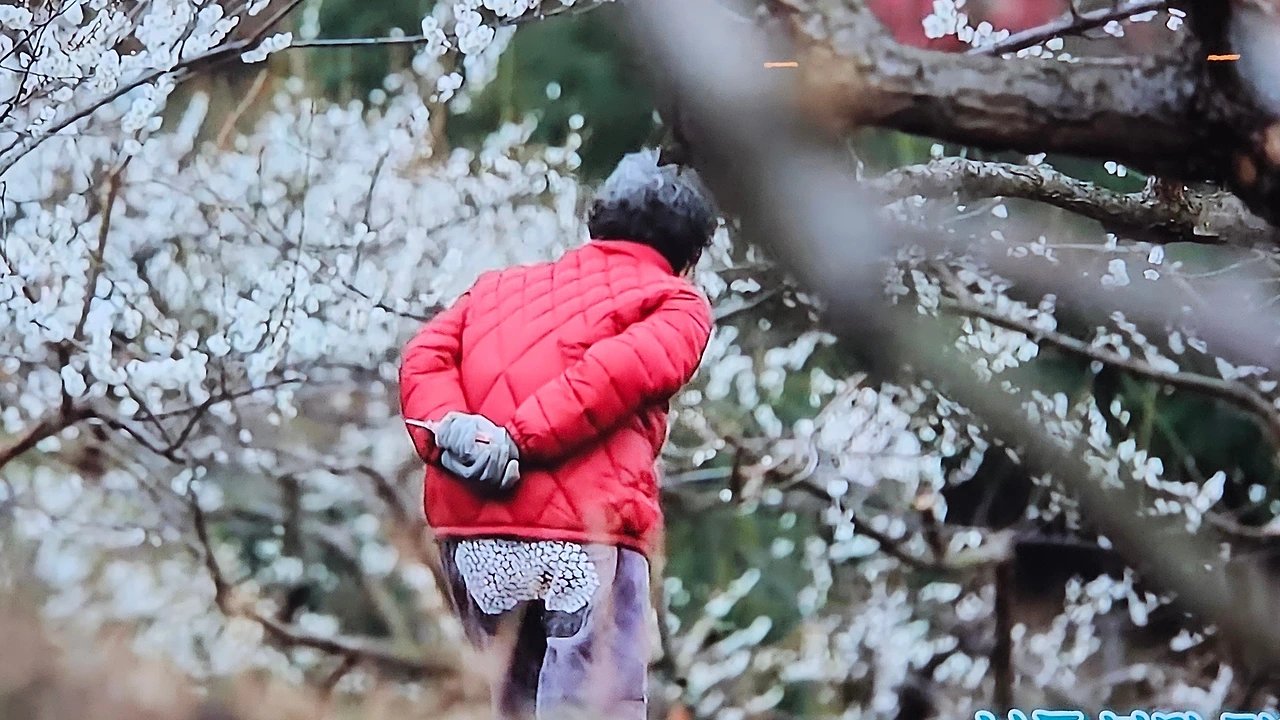 자신이 가꾼 매화마을을 걷는 홍싸리 할머니