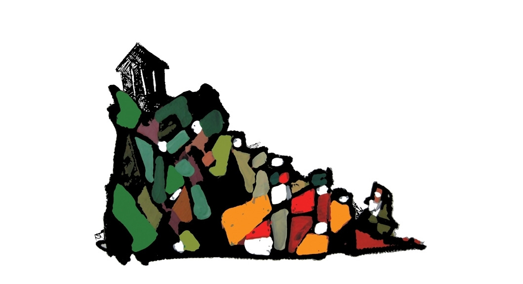 다섯 단계의 최고 높은 곳에 흰색의 신전을 표현하여