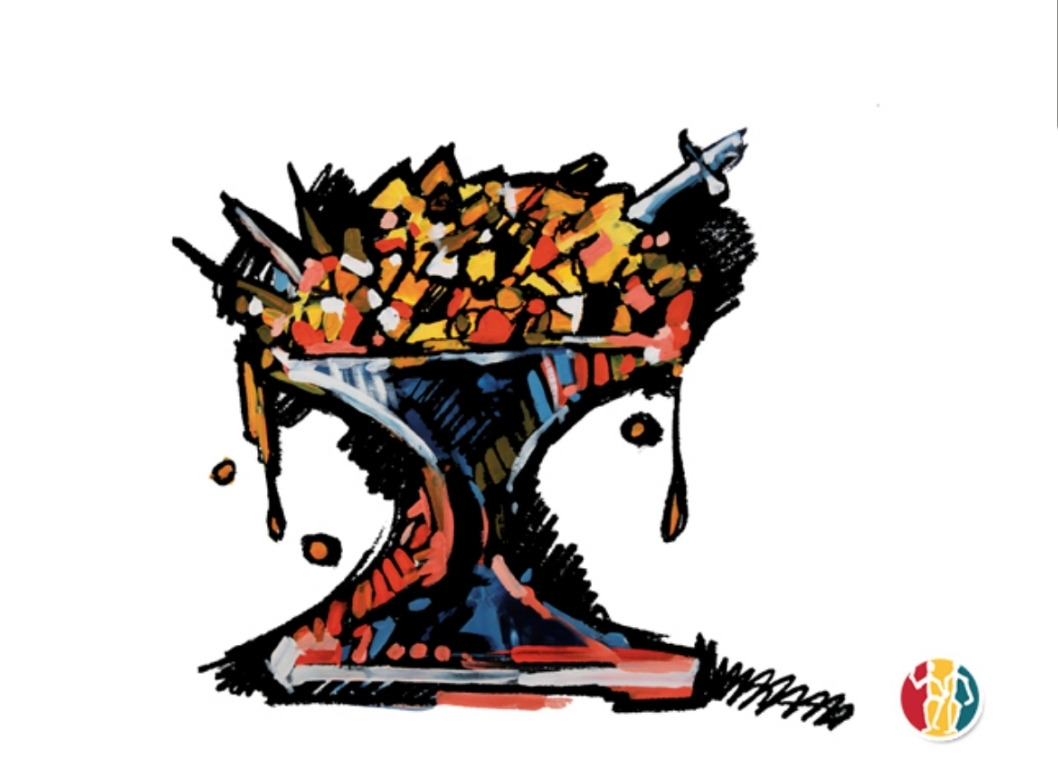 그림 속에 허리가 잘록한 유리잔이 그려져 있고 유리잔 속에는 금은보화가 가득 차 흘러넘치고 금은보화 속으로 칼자루가 꽂혀있다.