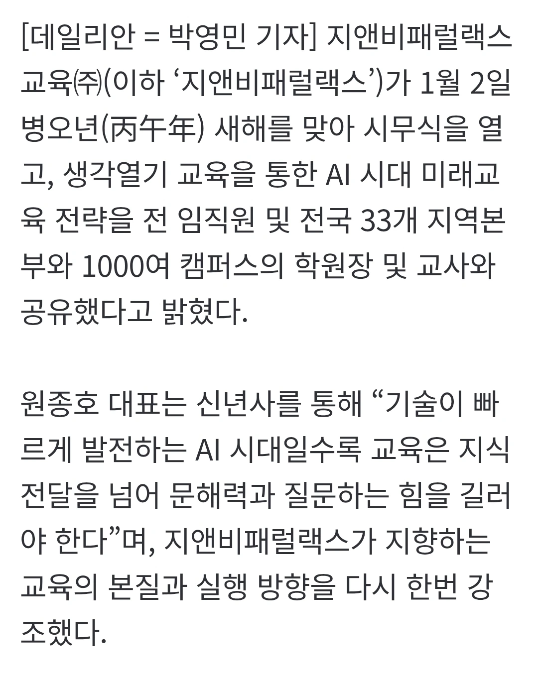 지앤비패럴랙스교육,새해 생각열기교육 비전 제시