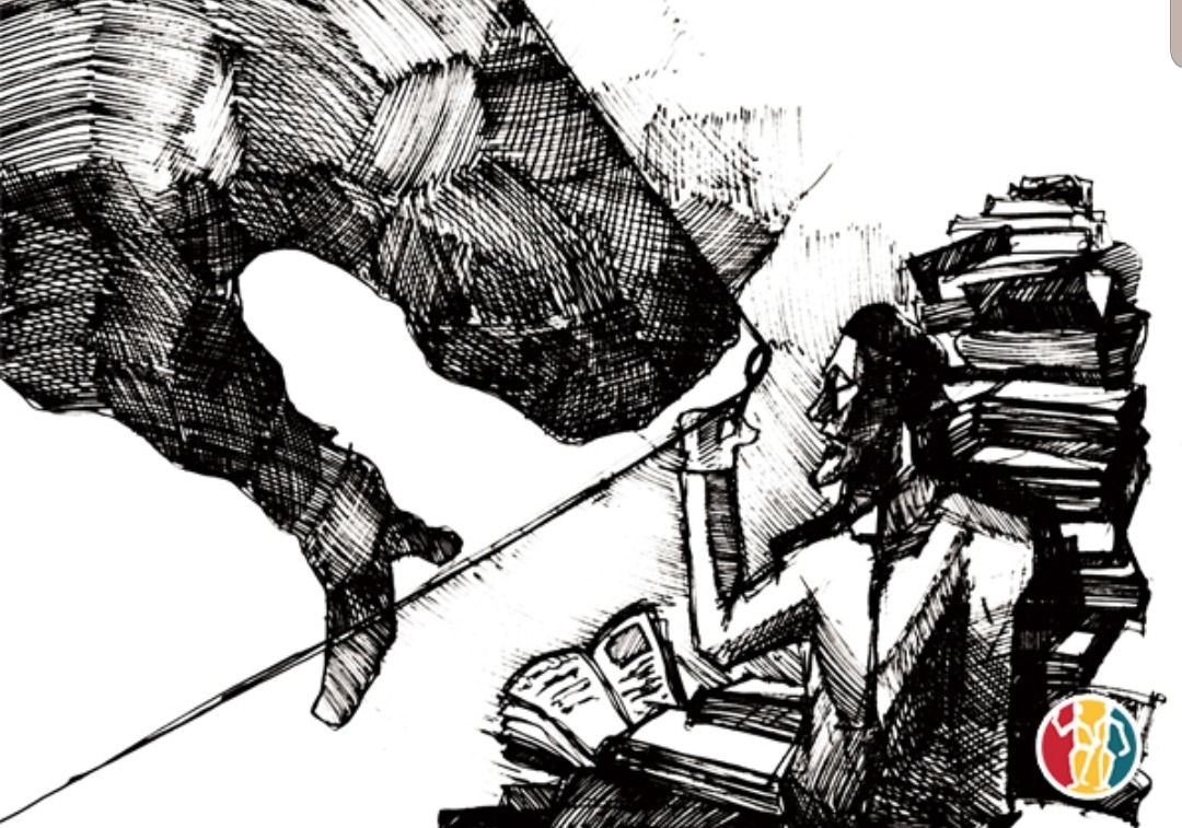 그림 2. 마키아벨리 등 뒤편으로 쌓여 있는 인문고전 책더미 스케치 조각 그림