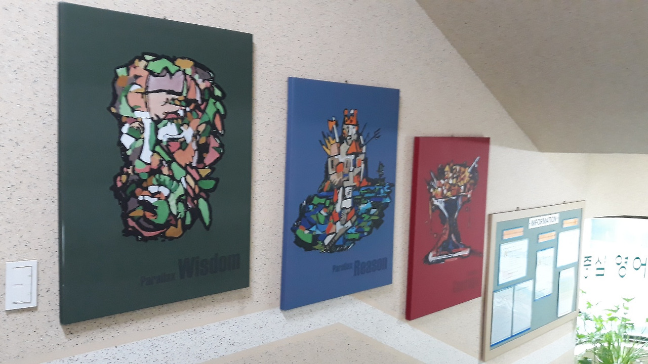 추상 그림 2는 오른편에 큰 방울 하나에 왕관이 씌워져 있고 왼편에는 알렉산더 대왕의 정복 으로 동서양 문화가 만나 꽃 피웠던 헬레니즘 문화의 상징인 라오콘 군상이 그려져 있습니다.