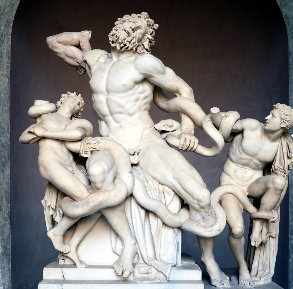 라오콘 군상, 트로이 신관 라오콘과 그의 두 아들이 트로이 전쟁 때 바다의 신 포세이돈에게 저주를 받는 장면을 묘사한 고대 그리스 조각상, 헬레니즘 문화의 특징을 잘 나타낸 조